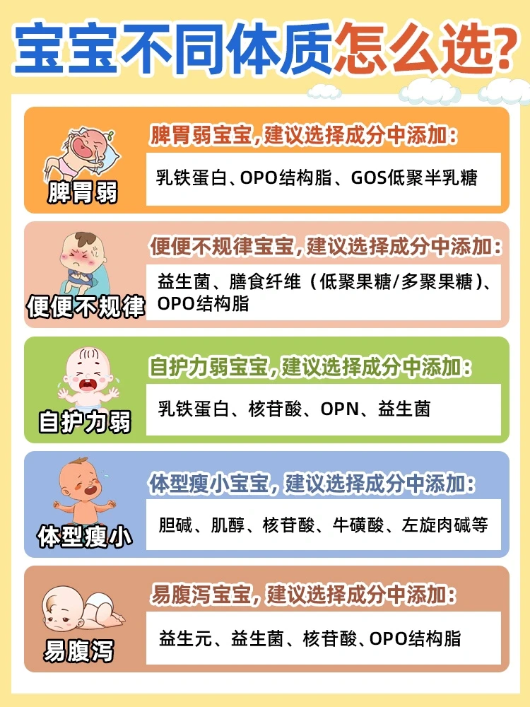 3⃣️结合宝宝体质:一定要结合宝宝的体质选适合宝宝的奶粉,尽量选一款营养丰富,不含不友好成分的奶粉
