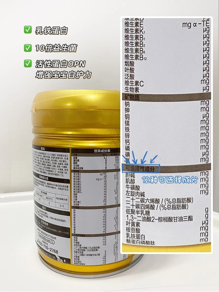 ✅可选成分:DHA、ARA、胆碱、乳铁蛋白、牛磺酸、OPN、OPO结构脂、核苷酸,益生菌等