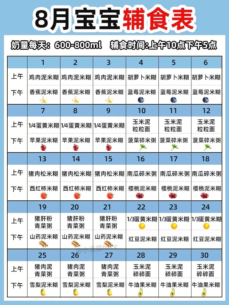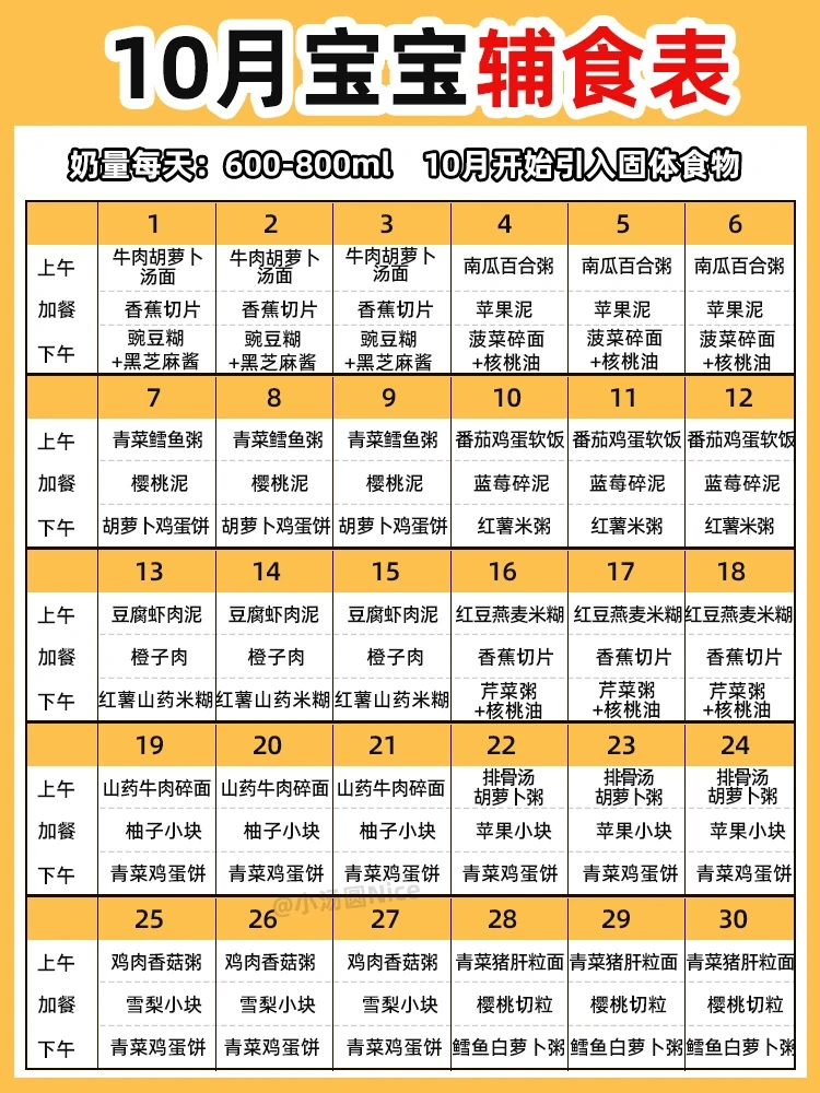 一天一顿上午10点,以高铁米粉、蔬菜泥为主