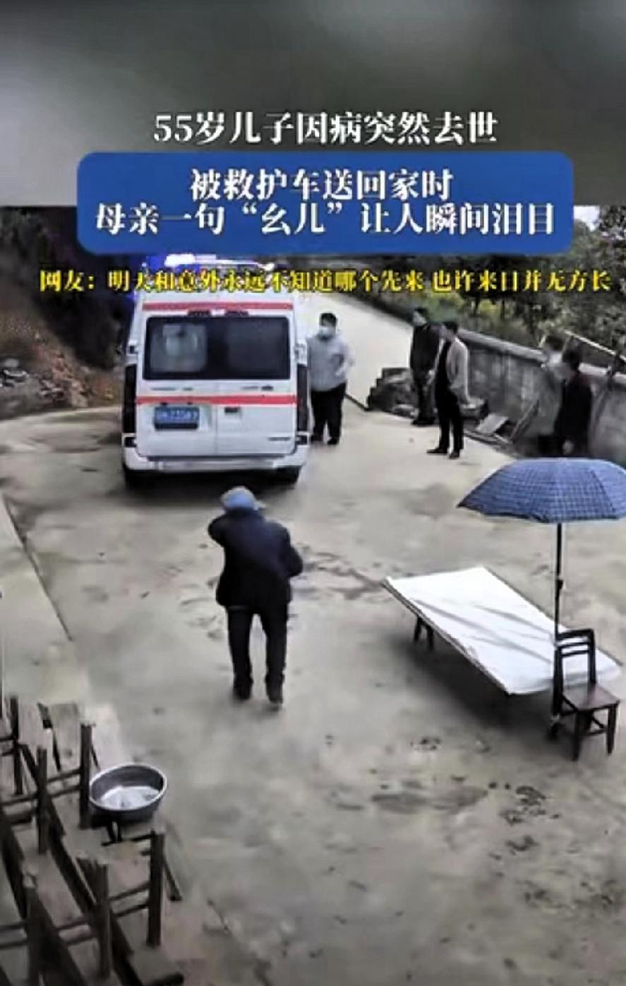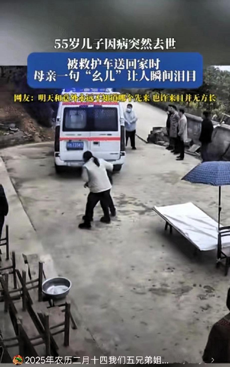 泪目了!贵州,一老人的55岁儿子因病突然去世,当儿子被救护车送回老家时,正在院里干活的老母亲得知后瞬间崩溃 哭喊着“幺儿”踉跄小跑过去的模样,看得人鼻头发酸,旁边的亲属邻居也忍不住红了眼眶,纷纷上前搀扶。 55岁,早已是能扛起家庭重担的年纪,可在母亲眼里,他永远是那个需要疼爱的孩子。老人一辈子操劳,弯腰驼背为儿女奔波,盼的不过是孩子平安顺遂,到头来却要承受白发人送黑发人的痛苦,这是为人父母最不愿面对的结局。 网友感慨,明天和意外,永远不知道哪个会先来。这话听着扎心,却是实实在在的现实。我们总以为日子还长,总把“常回家看看”挂在嘴边却懒得行动,总觉得孝顺可以慢慢来,却忘了生命其实很脆弱。一个转身,可能就是再也不见;一次拖延,或许就成了终身遗憾。 老母亲那一声哭喊,喊的是半生牵挂,是锥心不舍,更是无数人藏在心底的恐惧。我们总在为生活奔波,忙着赚钱,忙着打拼,却常常忽略了身边最该珍惜的人。能多打一个电话,就别偷懒;能多回一次家,就别犹豫;能多陪父母吃一顿饭,就别找借口。 毕竟,世间最无奈的遗憾,莫过于子欲养而亲不待;更让人难受的,是连尽孝的机会都没来得及抓住。