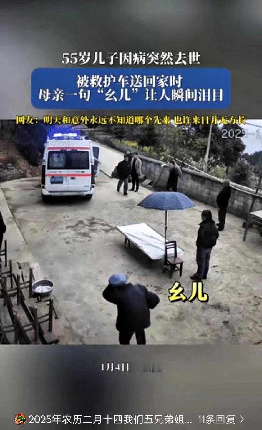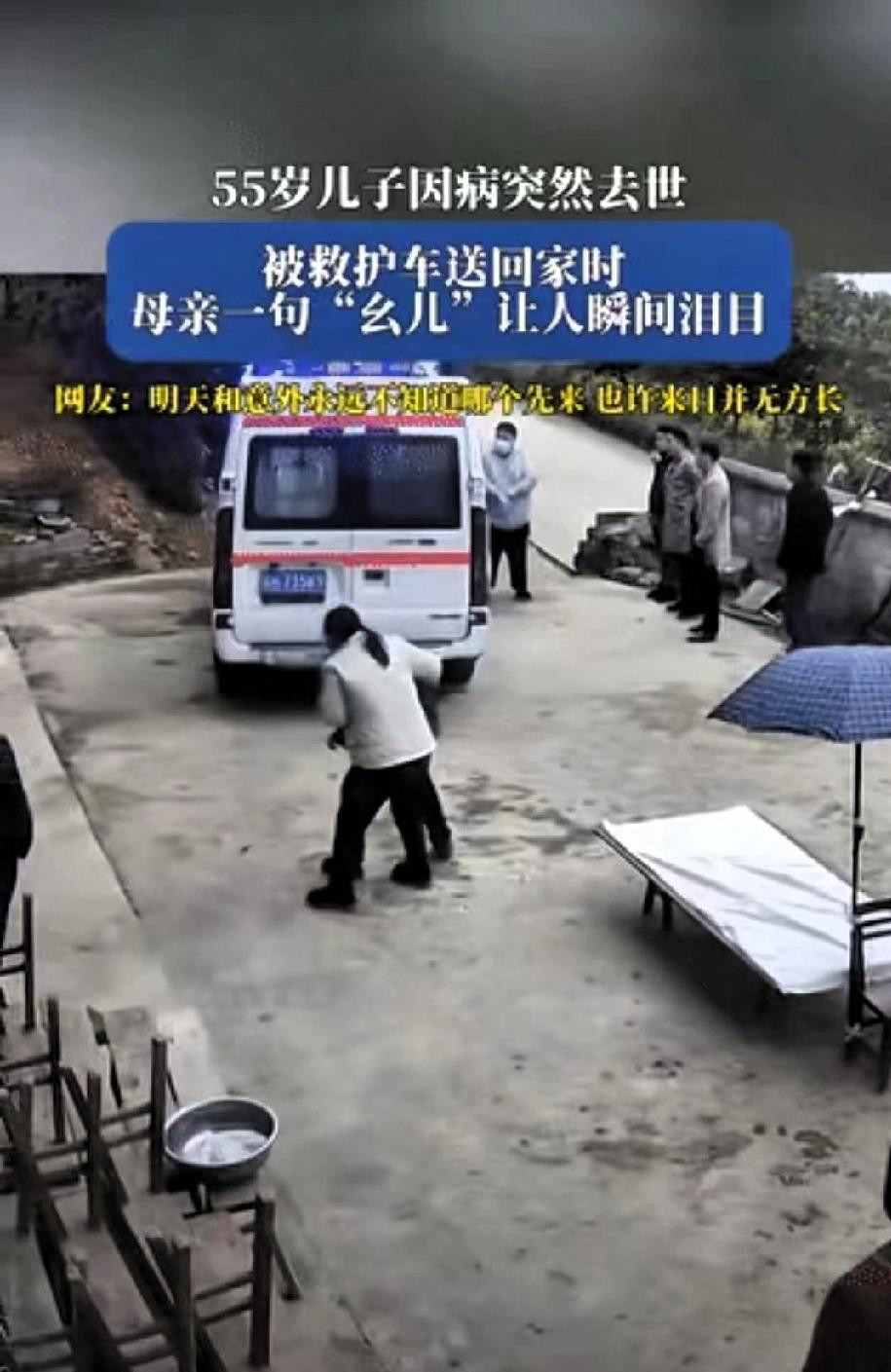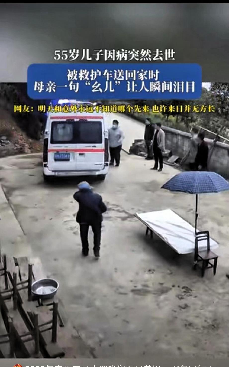 泪目了!贵州,一老人的55岁儿子因病突然去世,当儿子被救护车送回老家时,正在院里干活的老母亲得知后瞬间崩溃。 嘴里喊着“幺儿”,那声音里的颤抖和绝望,听得旁边的亲属邻居都忍不住抹眼泪。家里人怕老人情绪激动撑不住,连忙上前搀扶着把她劝进屋里,可谁都知道,这份白发人送黑发人的痛,哪是轻易能平复的。 操劳一辈子,她盼着儿子能平平安安,盼着逢年过节一家人能团团圆圆,怎么也没想到,等来的却是这样一场天人永隔的噩耗。 网友们纷纷感慨,人世间最残忍的事莫过于此,清瘦弯腰的老人,辛辛苦苦拉扯大孩子,到老了还要承受这样的打击,实在太让人心疼。其实我们总说“来日方长”,总把回家的计划往后推,总觉得还有很多时间可以陪伴父母,可现实就是这么无常,明天和意外,你永远不知道哪个会先来。 别等了,别让“子欲养而亲不待”的遗憾成真,趁爸妈还能和你唠唠家常,趁他们还能笑着喊你的小名,多打几个电话,多回几趟家,哪怕只是帮着扫扫地、做顿饭,也是最实实在在的陪伴。