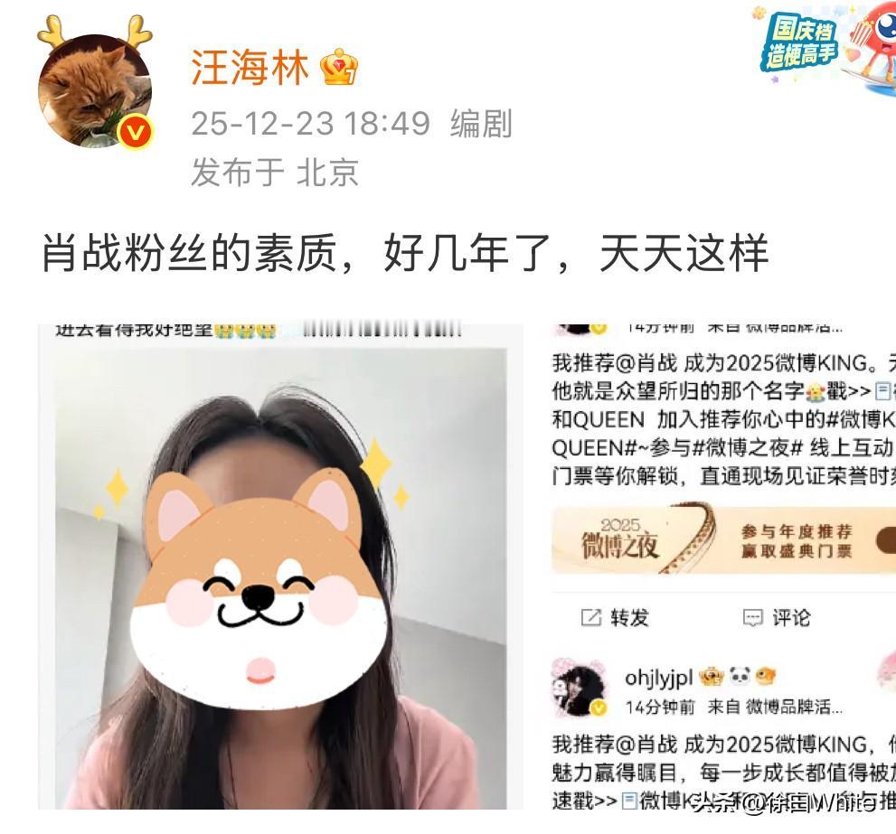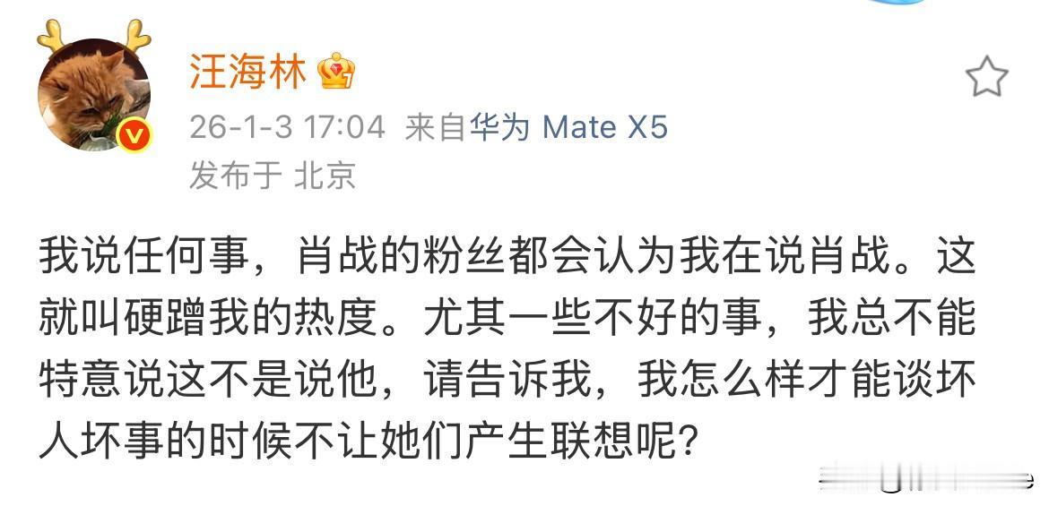 1月7日,这个汪海林怎么老跟肖战过不去? 今天看到他投诉肖战粉丝,隔三差五看他说肖战粉丝针对他,肖战粉丝怎么这么“闲”呢,不关注肖战的动态,老关注他动态(反语) 他一天到晚,不仅关注肖战,还关注肖战粉丝,一有什么风吹草动,他就跳出来蛐蛐人家,比我一个剧粉了解肖战动态都快…… 我觉得他并非真讨厌肖战,而是立讨厌肖战的人设来给自己增加话题度,毕竟肖战也没招惹过他,他干嘛讨厌肖战?很莫名其妙