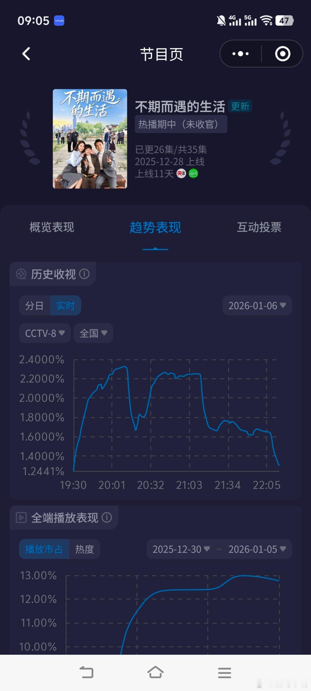 电视剧不期而遇的生活 前两集酷云平均2.045(cvb估值1.76),非大制作非大流量非重点推荐剧集,一部普通的积压剧都有这个成绩!可以预测《小城大事》收视率了。小城大事收视率展望:前几天酷云每天平均2.6,后面平均3.0,全集酷云平均2.90!史冠来了