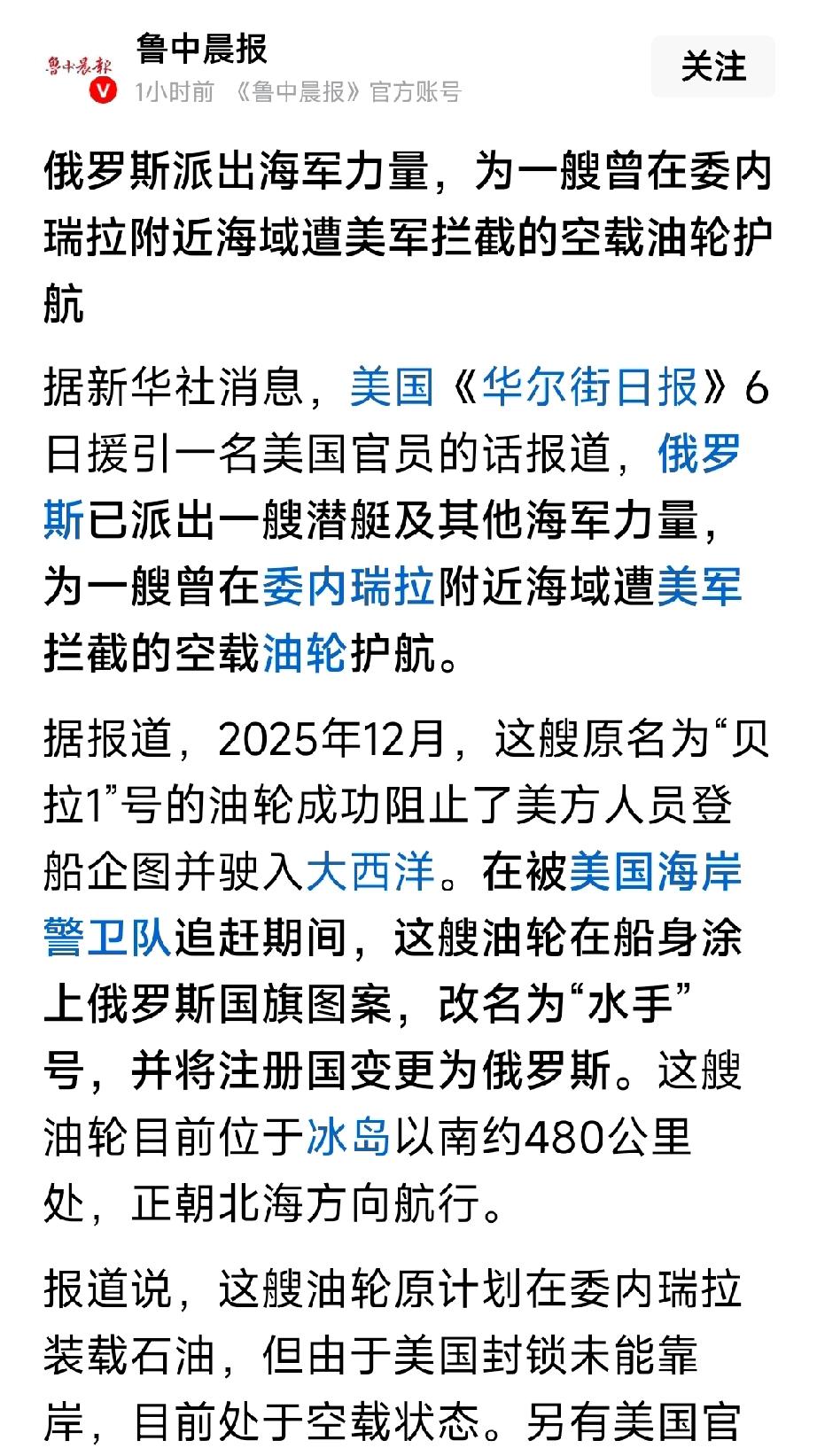 俄罗斯派出一艘潜艇以及海军力量,为一艘曾在委内瑞拉附近海域遭美军拦截的空载游轮护航。