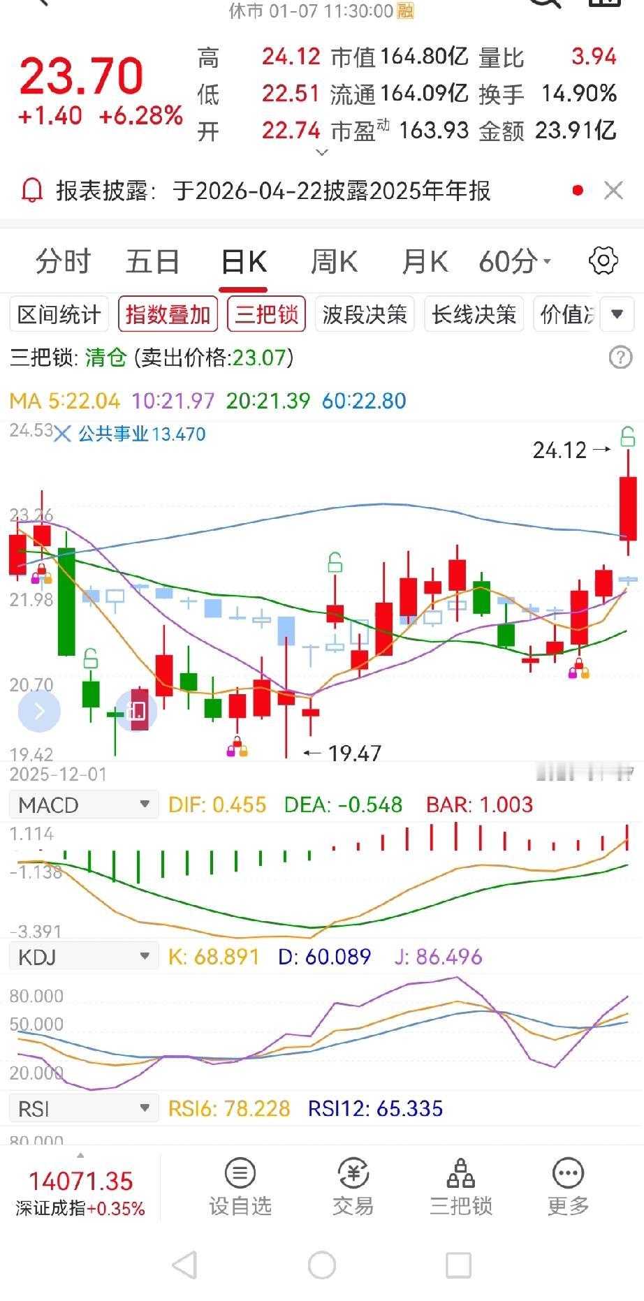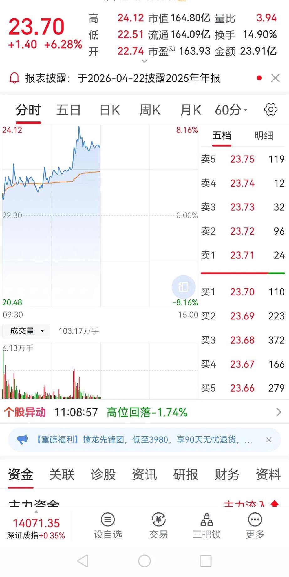 懊悔的一天!煮熟的鸭子飞了? 周五21.9买入的凯美TQ,今天开盘21.51,没有回调,直接冲到22.74,我一看今天放量了,势头不错,在它冲击23块时果断清仓。本以为锁定利润落袋为安,谁知道这竟是“悲剧”的开始——我刚卖出,股价一路飙升,最高冲到24.12!算下来,足足少赚了一大截,心里真不是滋味。 不过转念一想,短短四天,四千块利润到手,也算知足。可能我真没有那个一夜暴富的命,细水长流赚点零花钱,也挺好。 今天有同样操作凯美的朋友吗?你们都是怎么把握买卖点的?来聊聊心得吧。。凯美锂电池 炒股技巧