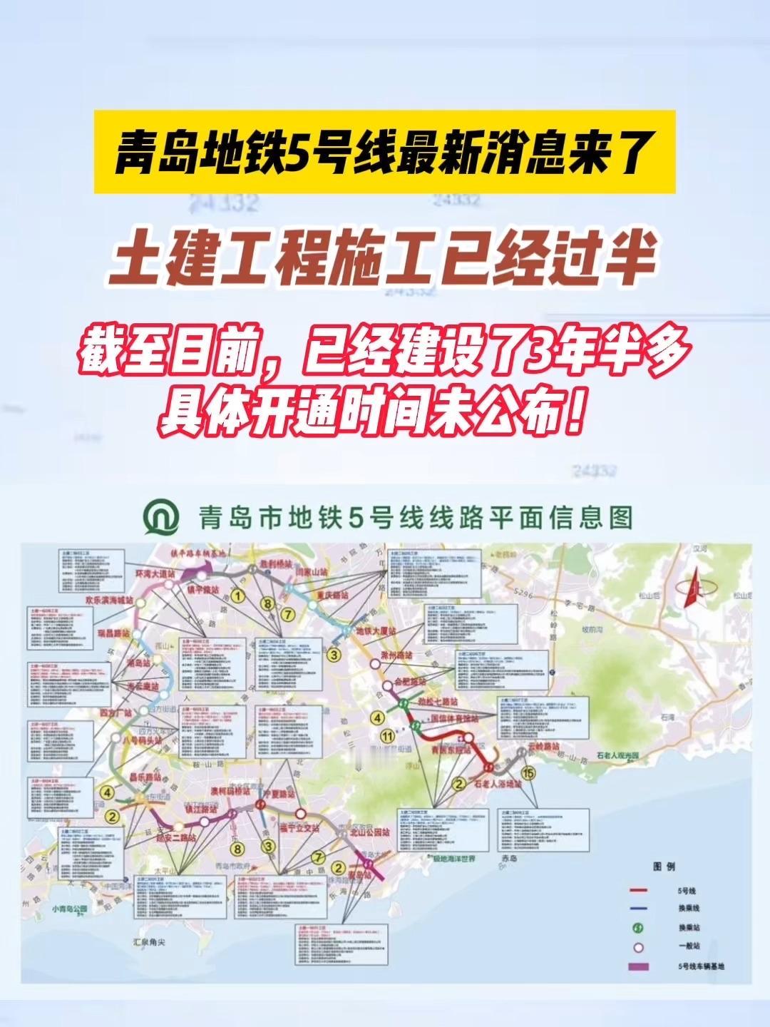 青岛地铁5号线 青岛地铁5号线起于麦岛站,终于云岭路站,总长约32.6公里,共设车站27座,其中换乘站12座,具有典型的“C”形环线特征,定位为大运量等级骨干线路,均为地下线,项目投资260.3亿元,建设工期为5年,采用B型车6辆编组,最高运行时速80公里,计划2028年完工。 这条线路途经青岛啤酒博物馆、信号山公园等景点,以后游玩超方便。而且它有12个换乘站,能和8条线路衔接,出行会更加便捷。青岛地铁 青岛地铁 青岛站地铁站 青岛地铁时间表