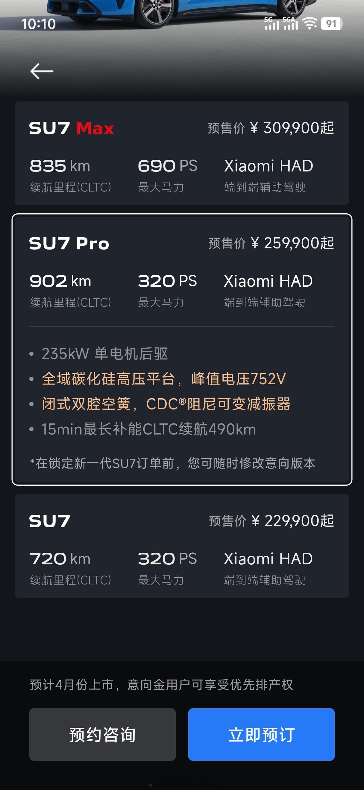 新一代小米SU7小订价格22.99万起标准版:续航720km,235kw单电机,752V高压平台,15分钟补能450kmPro版:25.99万,续航902km,闭式双腔空气悬架,感觉这个性价比更高,不过一般的话720km续航已经足够了Max版:30.99万,续航835km,508KW双电机四驱,15分钟补能670km(10%-90%)。5C超充了