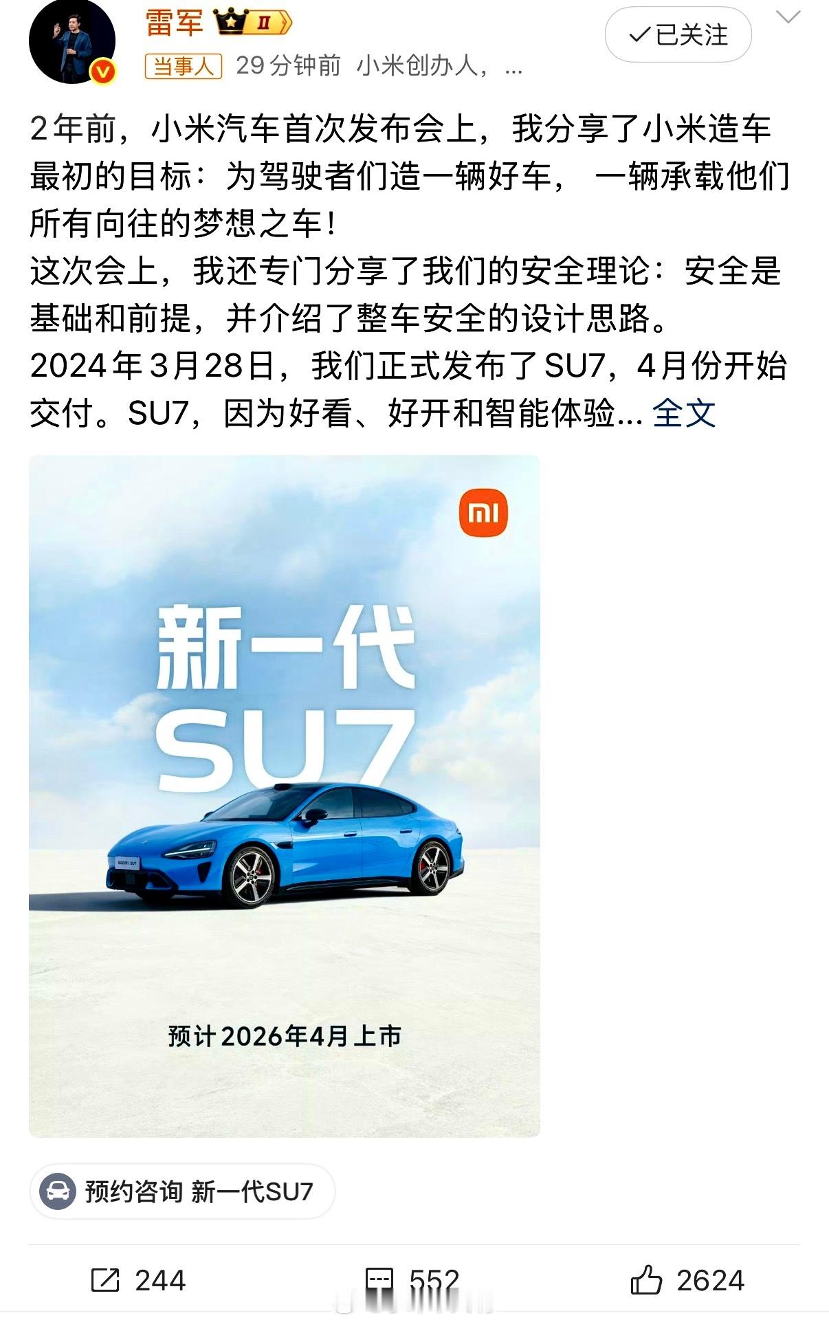今天有个好消息:雷总官宣小米SU7首次改款来了,新一代SU7将在4月正式登场!全新配色「卡布里蓝」上线,还有新轮毂、新内饰,颜值再升级。1、 全系标配激光雷达,辅助驾驶直接拉满2、 续航迎来重大突破,跑得更远、充得更快3、 搭载更先进的智能底盘,操控更稳、驾感更爽4、 智能座舱全面进化,交互更聪明,体验更流畅5、 安全性能也进一步提升,开得快,更要开得安心。