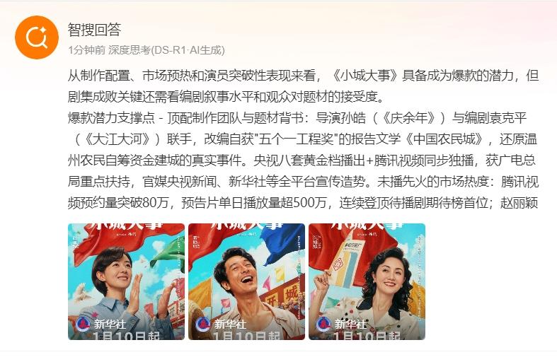 《小城大事》还没开播已经被唱衰了 今天的热搜是“小城大事能爆吗”,一些电视剧博主已经开始唱衰,觉得扑街概率大,这部剧的题材肯定是没有仙侠剧的观众盘大,应该也不太吸引年纪小的观众,赵丽颖出道19年第一部央视上星剧,能拿到央五的成绩就是有效播剧。