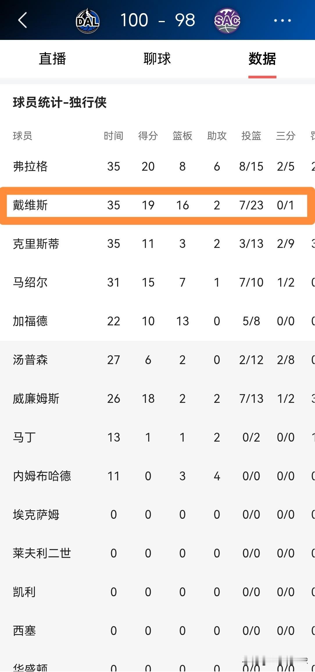 我强烈建议独行侠不惜一切代价的交易走浓眉!在今天独行侠客场以100:98力克国王的比赛中,浓眉的进攻效率真是惨不忍睹,他在首发出战的35分钟里,投篮23中7,其中三分球1中0、罚球7中5极其低效的得到19分,还出现了3次失误,他的场上正负值为-6。 作为一名内线球员,浓眉在国王内线实力羸弱的情况下竟然打出了如此低效的进攻,试问独行侠还有必要留着浓眉吗?