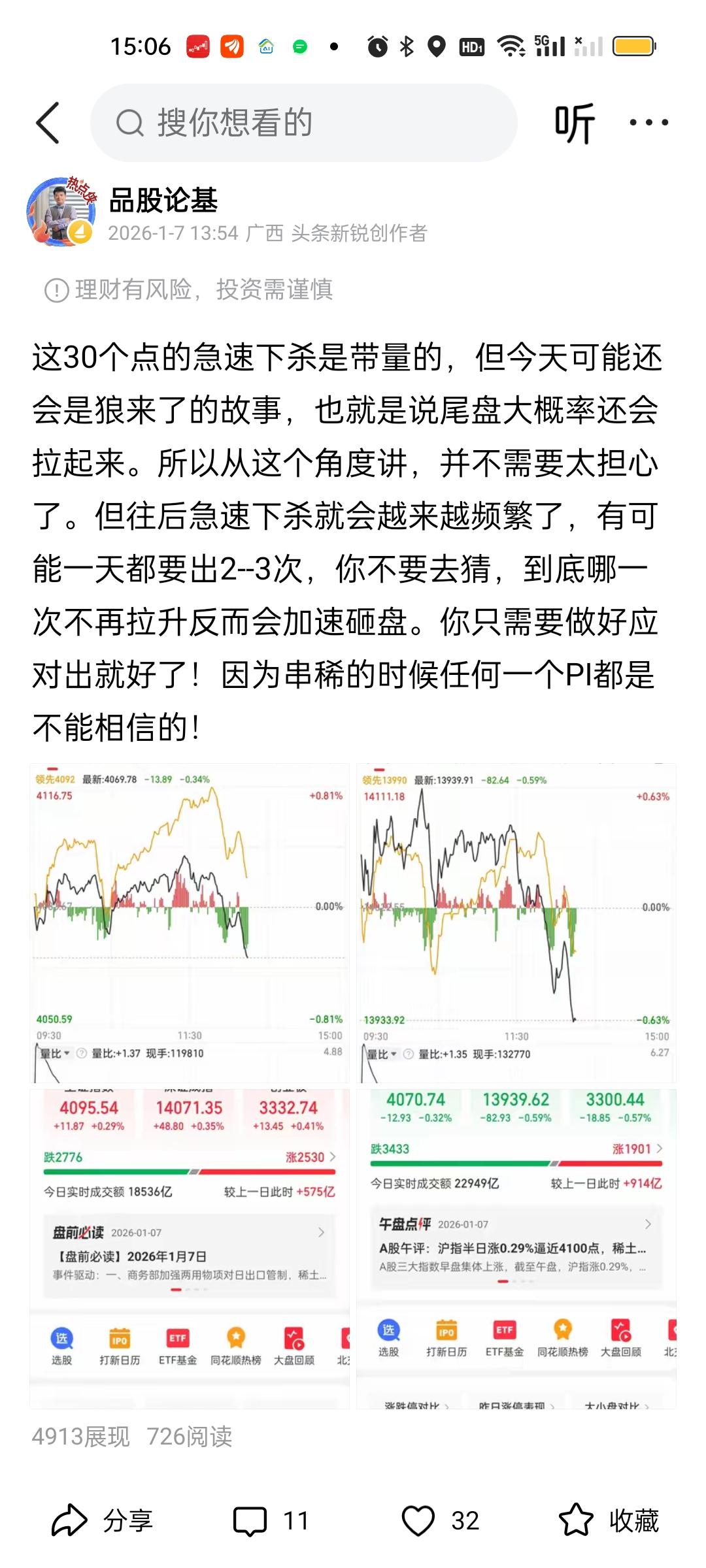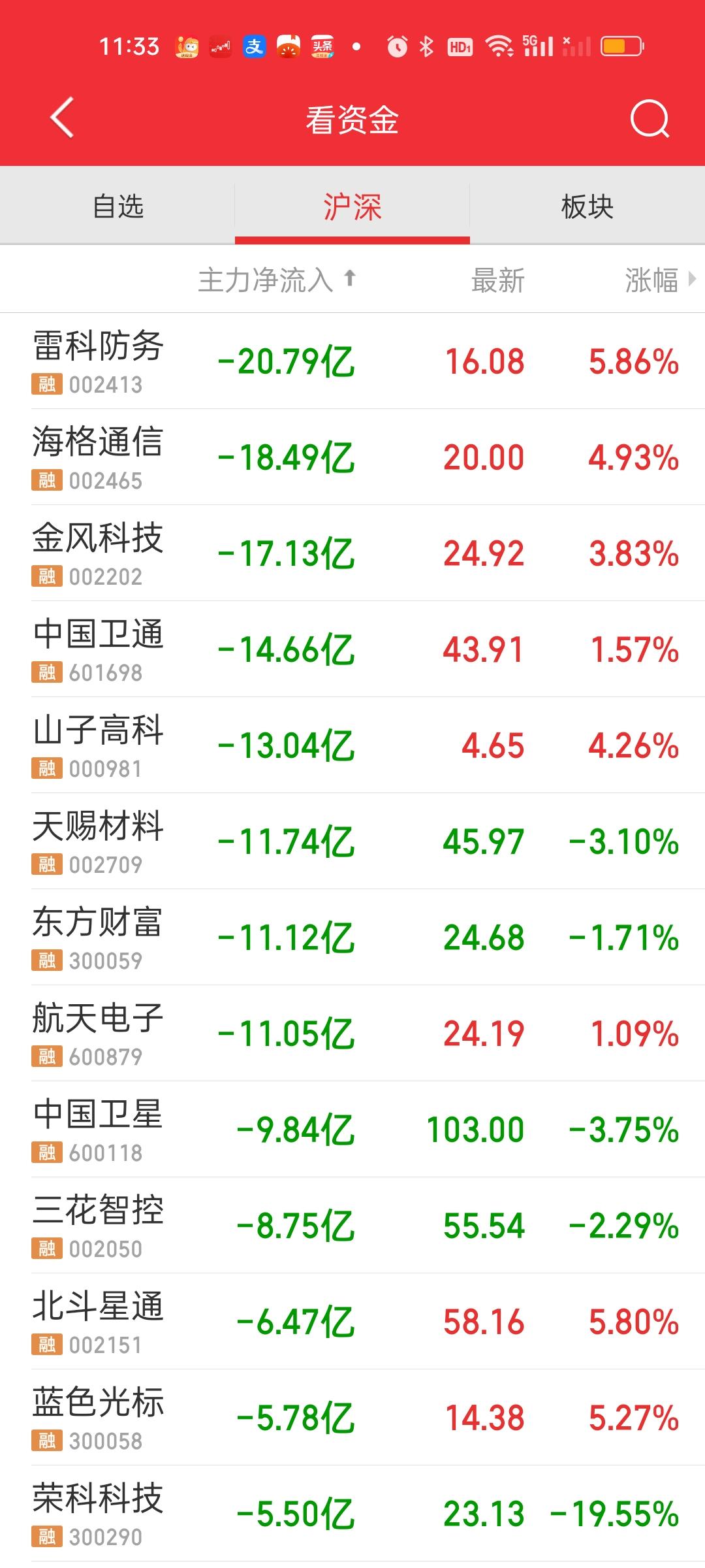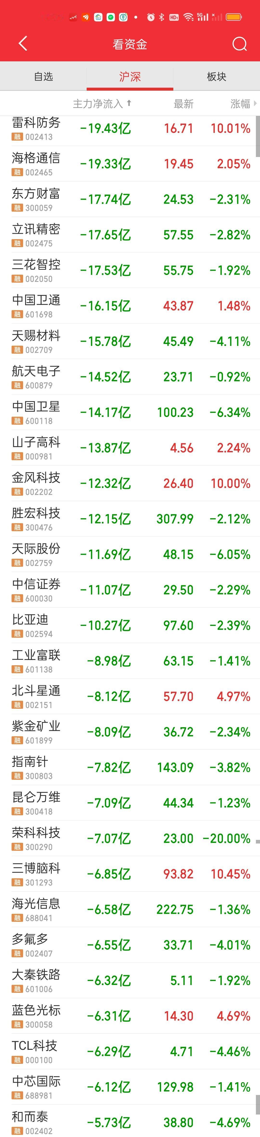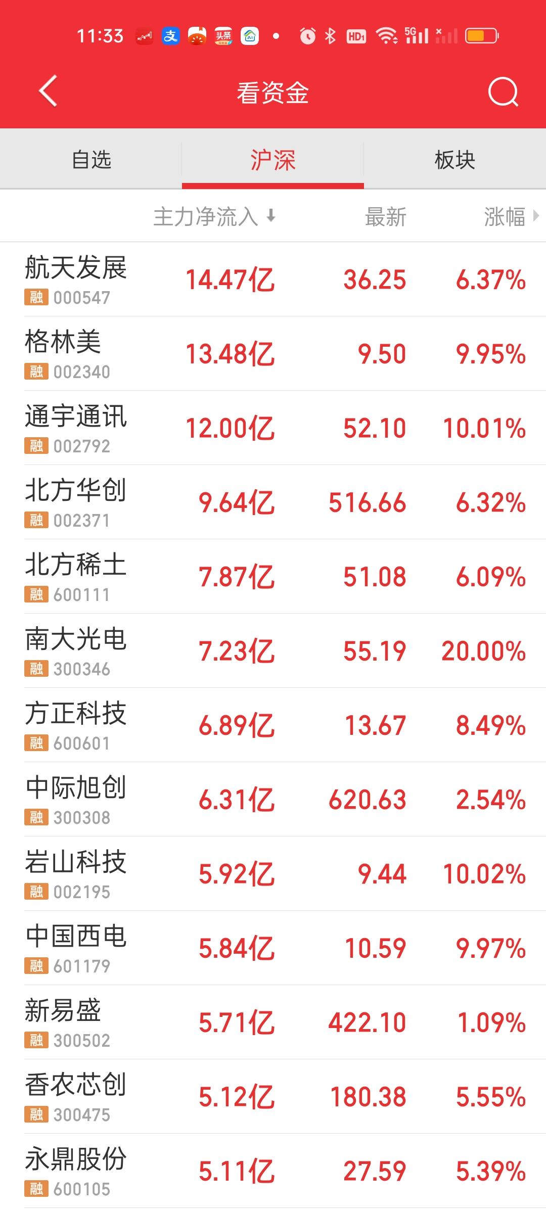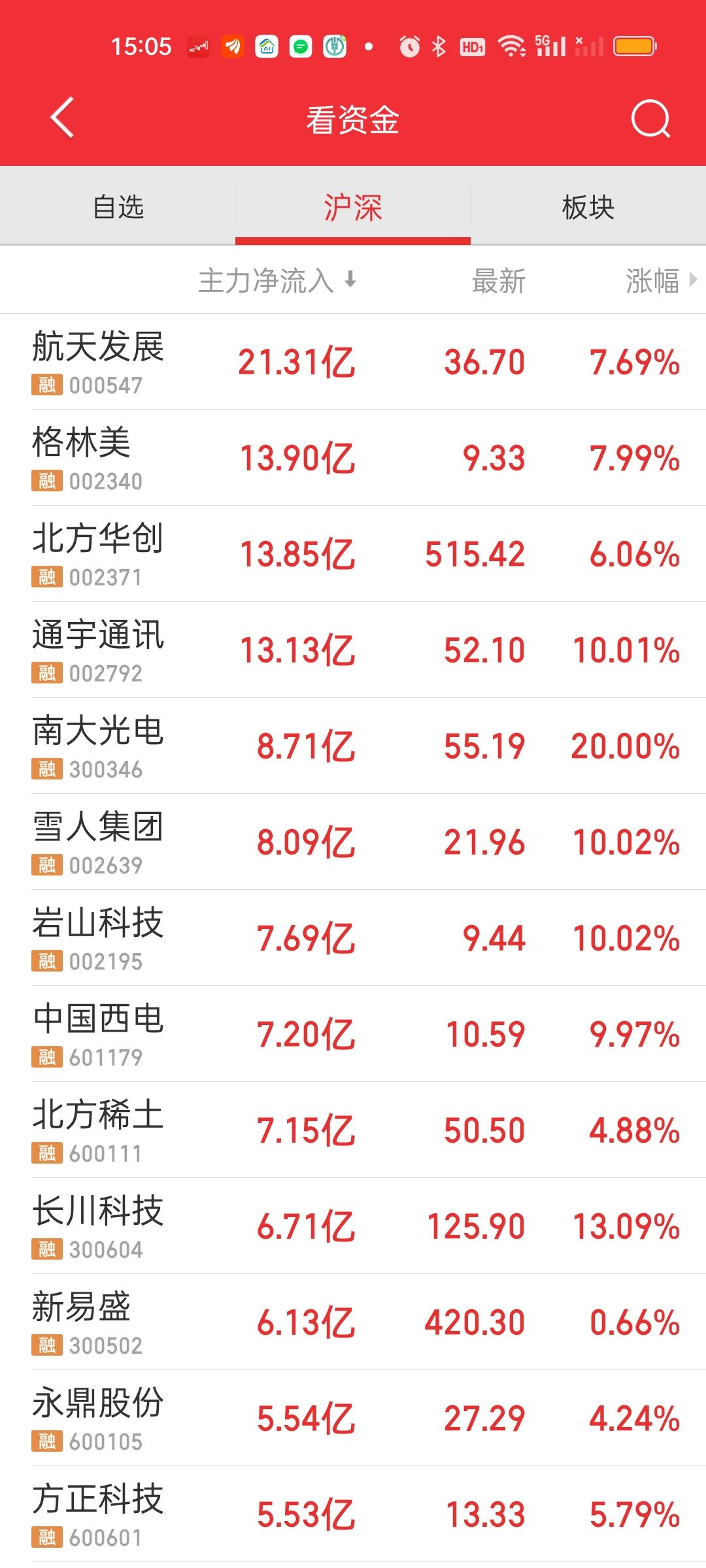 收盘了,下午一点多的时候有一次30点的急速下杀,而且这个下杀是带量的。我认为是狼来了的故事,尾盘就会拉起来,让大家放宽心,不用惊慌。结果也正如我说的一样,尾盘果然拉起来了。但后面每一次急速下杀,风险就要被放大。因为一次40个点的急速下杀假如不拉,亏损效应是非常大的。 尽管今天上证指数继续创出了11年来的新高,指数也强势收获14连阳,但今天的大盘有一种明显放量滞胀的感觉,也就是说向上空间可能并没有多大了,今天最高点距离4100点就差1.22点。明后天可能还会冲击一下高点,就会向下回落了。不过回落也不用害怕,是捡筹码的好机会。 主力资金净流入方面,净流入超过10亿的个股增加了北方华创。但资金净流出超过10亿的个股大幅增加了一倍。上午收盘只有8只,但全天收盘有15只。可以清楚的看到资金在加速流出。