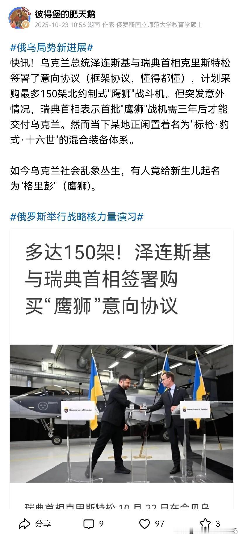 #俄乌冲突# 好家伙,泽圣的“鹰狮”梦黄了 这意味着泽圣团伙的“史密斯专员”失去了在这个项目上的盈利机会。 瑞典首相乌尔夫・克里斯特松在基辅和华盛顿参与的 “意愿联盟” 会议后表示,只有达成和平协议,瑞典才准备向乌克兰移交 “鹰狮” 战斗机。 他指出,瑞典 “准备通过提供用于空中巡逻的战斗机和用于黑海扫雷的海上资源,来帮助维护乌克兰的和平”。 此外,据他称,重要条件还包括 “多国部队” 明确的交战规则以及议会的批准。 根据 2025 年 10 月 22 日的协议,斯德哥尔摩承诺在 10 到 15 年内提供多达 150 架战斗机,这些飞机并非免费移交 —— 该项目计划采用 “联合融资以及国防工业合作的长期发展” 模式。 来源:乌克兰国家通讯社 #英法或将向乌克兰部署部队##俄派潜艇为遭美拦截油轮护航#