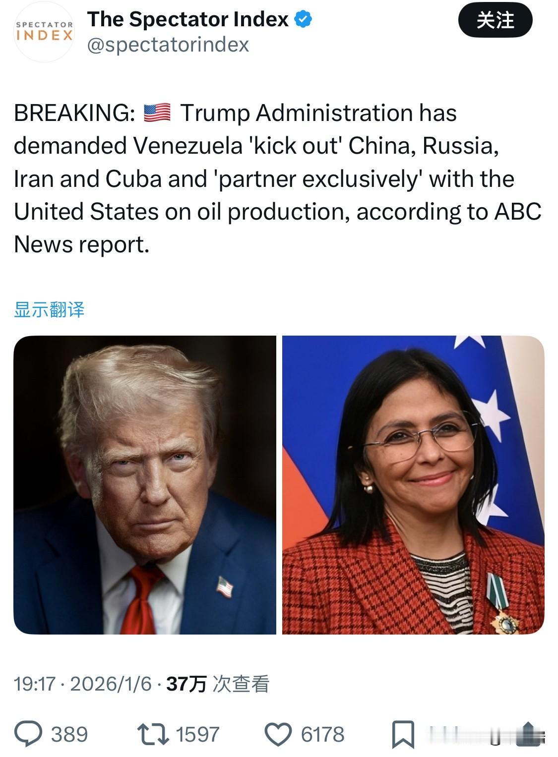 突发:据美国广播公司新闻报道,特朗普政府要求委内瑞拉“驱逐”中国、俄罗斯、伊朗
