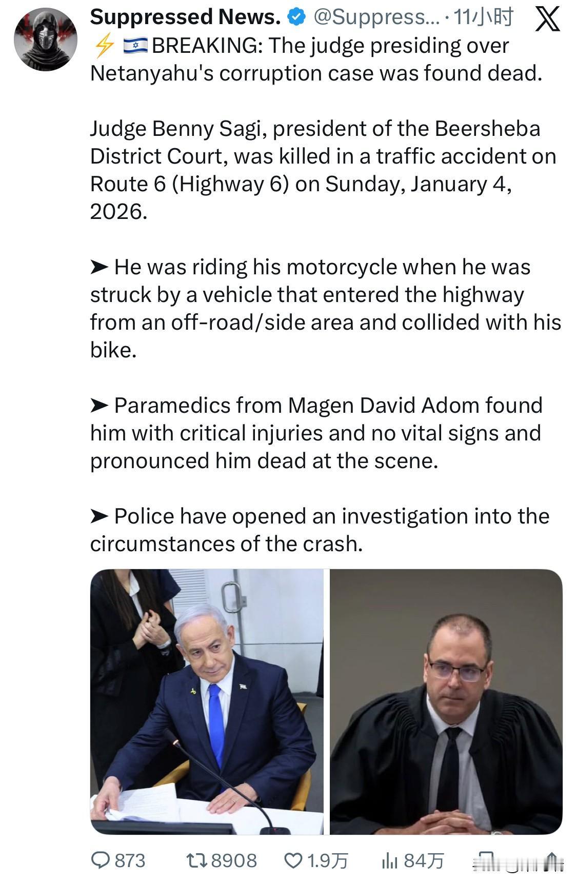 突发新闻:审理以色列内塔尼亚胡腐败案的法官被发现死亡。 2026 年 1 月 4 日星期日,贝尔谢巴地区法院院长本尼·萨吉法官在 6 号公路(6 号高速公路)上发生的一起交通事故中丧生。 ➤他骑着摩托车时,被一辆从路边驶入高速公路的车辆撞倒,该车辆与他的摩托车相撞。 ➤以色列红十字会的医护人员发现他身受重伤,没有生命体征,当场宣布他死亡。 ➤警方已对这起车祸的情况展开调查。