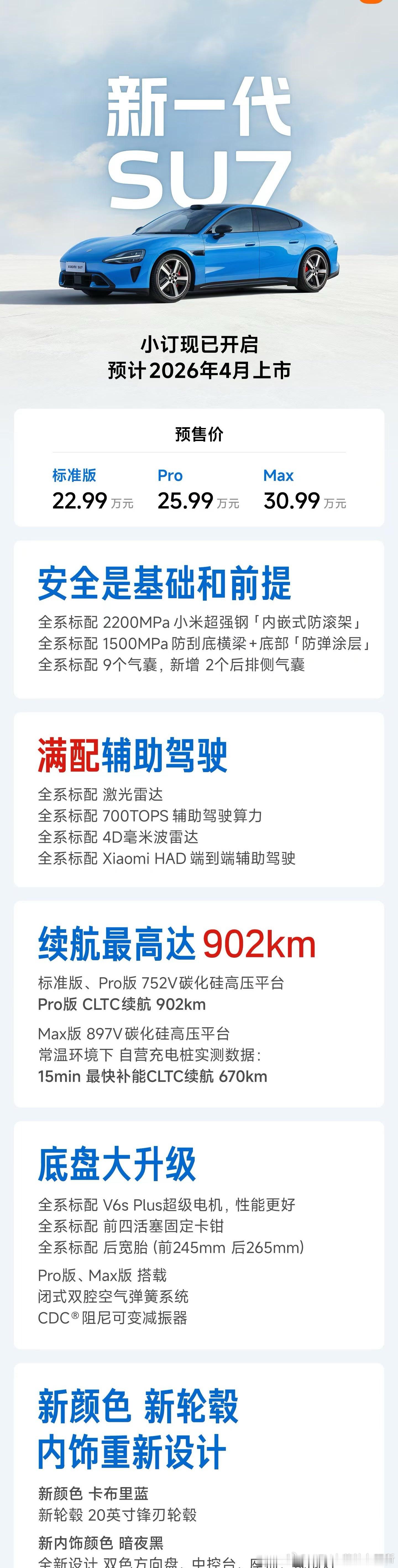 小米新一代SU7要来了,预计2026年4月上市,预售价22.99万元起。在售的 SU7 价格是 21.59万元,新款上市价应该也差不多。值得一提的是,锁单未交付SU7车主,可限时升级。辅助驾驶方面,现款入门车型后驱长续航智驾版未配备激光雷达,且芯片算力较低。此次升级后,全系都将配备激光雷达,并标配辅助驾驶小蓝灯,全系标配700TOPS辅助驾驶算力芯片,全系升级Xiaomi HAD辅助驾驶系统。雷军官宣新一代su7