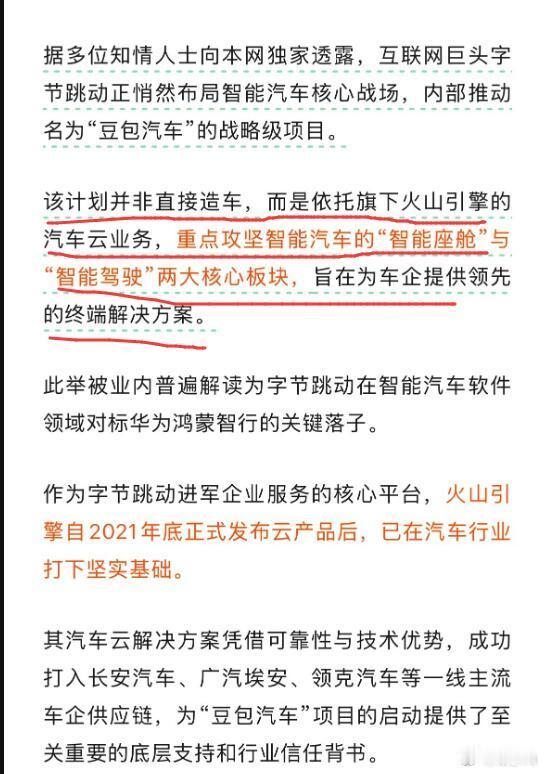 既然可以做豆包手机,那么也可以做豆包汽车,只不过难度要大很多,烧钱也得高好几个数量级。字节跳动只是否认了“造车”,但没说别的,那就是还有可能性,但我觉得直接组件整车生产是不太可能的,最大的可能性就是跟某个车企合作,深度植入字节跳动旗下的各种解决方案,然后贴个logo就可以了。但问题也来了,这算是“买软件送车”呢,还是“买车送软件”呢?字节否认造车豆包汽车字节跳动否认和车企联合造车