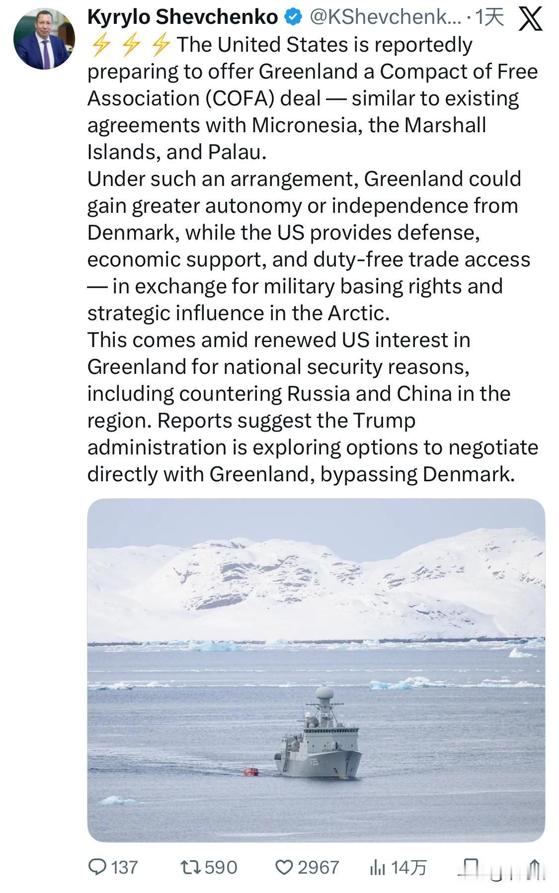 据报道,美国正准备向格陵兰岛提供一份自由联系条约(COFA)协议——类似于与密克罗尼西亚、马绍尔群岛和帕劳达成的现有协议。 根据这样的安排,格陵兰岛可以获得比丹麦更大的自治权或独立权,而美国则提供国防、经济支持和免税贸易准入——以换取在北极的军事基地使用权和战略影响力。 鉴于美国出于国家安全考虑,包括在该地区对抗俄罗斯和中国,对格陵兰岛的兴趣再度高涨,有报道称,特朗普政府正在探索绕过丹麦,直接与格陵兰岛进行谈判的方案。