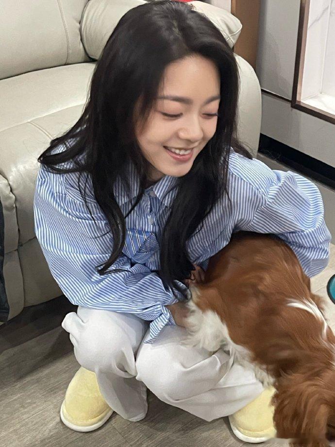 赵今麦和拿铁合照 赵今麦和狗狗拿铁合照 赵今麦和拿铁合照,麦麦条纹衫搭配休闲裤的造型超随性,和拿铁的互动也尽显温柔