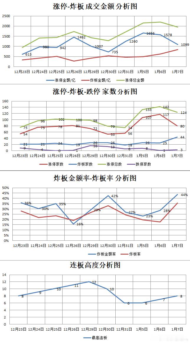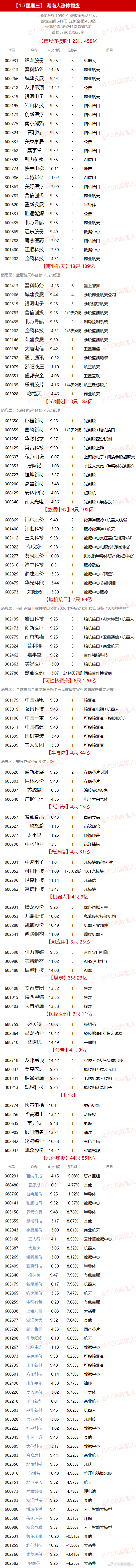 【1.7星期三】 湖南人涨停复盘 "涨停金额:1099亿 炸板金额:851亿首板金额:641亿 连板金额:458亿涨停80家 炸板44家 跌停3家首板57家 连板23家" 【市场连板股】23只 458亿 代码 名称 末次时间 连板数 原因002931 锋龙股份 9:25 8 机器人002413 雷科防务 14:26 6 商业航天600266 城建发展 9:44 4 商业航天002718 友邦吊顶 14:42 4 公告002519 银河电子 9:25 3 商业航天002195 岩山科技 9:25 3 脑机接口002173 创新医疗 9:25 3 脑机接口600775 南京熊猫 9:25 3 脑机接口002324 普利特 9:25 3 脑机接口600337 美克家居 9:25 3 公告002462 嘉事堂 9:32 3 脑机接口603598 引力传媒 9:35 3 AI应用002774 快意电梯 10:11 3 地产300986 志特新材 11:02 3 AI应用301363 美好医疗 13:09 3 脑机接口600783 鲁信创投 9:25 2 商业航天000620 盈新发展 9:25 2 半导体001331 胜通能源 9:25 2 公告600435 北方导航 9:35 2 商业航天600869 远东股份 9:49 2 数据中心002788 鹭燕医药 13:07 2 脑机接口001400 江顺科技 13:39 2 数据中心002202 金风科技 14:51 2 商业航天【商业航天】13只 439亿 消息面:蓝箭航天科创板IPO获受理 002413 雷科防务 14:26 6 星上智算600266 城建发展 9:44 4 参股商业航天公司002519 银河电子 9:25 3 参股格思航天600783 鲁信创投 9:25 2/9天7板 参股蓝箭航天600435 北方导航 9:35 2 制导控制系统002202 金风科技 14:51 2/8天4板 参股蓝箭航天002146 荣盛发展 9:39 1 参股蓝箭航天600198 大唐电信 9:42 1 卫星通信002792 通宇通讯 10:32 1 参股蓝箭鸿擎301079 邵阳液压 11:10 1 航空航天688651 盛邦安全 14:08 1 卫星互联600135 乐凯胶片 14:16 1/4天2板 航空遥感胶片603028 赛福天 14:46 1 商业航天【光刻胶】10只 183亿 消息面:长鑫科技科创板IPO获受理 603650 彤程新材 9:25 1 光刻胶000859 国风新材 9:30 1/3天2板 光刻胶+脑机接口301256 华融化学 9:37 1 光刻胶配套试剂603125 常青科技 9:39 1 光刻胶上游600637 东方明珠 10:07 1 上海微电子+间接参股超聚变002853 皮阿诺 11:08 1 实控人变更(半导体光刻胶)688727 恒坤新材 13:37 1 光刻胶300200 高盟新材 13:48 1 光刻胶688125 安达智能 14:03 1 点胶机300346 南大光电 14:56 1 光刻胶+存储芯片【数据中心】9只 105亿 600869 远东股份 9:49 2 微通道液冷+机器人线缆001400 江顺科技 13:39 2 液冷微通道+航天002112 三变科技 9:38 1 数据中心变压器(马斯克xAI)002922 伊戈尔 9:38 1 数据中心电源(供货特斯拉)002277 友阿股份 10:08 1 拟收购半导体资产(数据中心)603516 淳中科技 10:31 1 液冷散热002929 润建股份 13:33 1 数据中心(阿里)600475 华光环能 13:44 1 数据中心节能项目600673 东阳光 13:50 1 数据中心液冷【脑机接口】7只 69亿 消息面:马斯克旗下脑机接口公司2026年将启动脑机接口设备“大规模生产” 002195 岩山科技 9:25 3 脑机接口+AI大模型+机器人002173 创新医疗 9:25 3 脑机接口600775 南京熊猫 9:25 3 脑机接口+卫星通信+机器人002324 普利特 9:25 3 脑机接口+商业航天002462 嘉事堂 9:32 3 合作强脑科技301363 美好医疗 13:09 3 脑机接口002788 鹭燕医药 13:07 2/14天7板 间接合作博睿康【可控核聚变】6只 120亿 消息面:全球首台全高温超导托卡马克核聚变实验装置取得重要进展 601179 中国西电 9:39 1 核聚变603015 弘讯科技 9:43 1 核聚变电源+机器人601106 中国一重 9:45 1 可控核聚变(控股股东)601611 中国核建 9:48 1 可控核聚变601399 国机重装 13:48 1 可控核聚变002639 雪人集团 13:50 1 可控核聚変【半导体】4只 34亿 消息面:美股存储公司集体大涨 000620 盈新发展 9:25 2 存储芯片封测605303 园林股份 9:40 1 存储芯片688037 芯源微 10:33 1 涂胶显影设备688548 广钢气体 14:36 1 电子大宗气体【大消费】4只 13亿 603057 紫燕食品 10:43 1 卤制食品002627 三峡旅游 11:16 1 高端邮轮603877 太平鸟 11:26 1 服饰服装000798 中水渔业 13:31 1 远洋捕捞【光通信】4只 31亿 003031 中瓷电子 11:01 1 光模块(陶瓷外壳)603052 可川科技 11:09 1/3天2板 1.6T光模块002796 世嘉科技 11:14 1 光通信688662 富信科技 13:47 1 光模块【机器人】4只 9亿 002931 锋龙股份 9:25 8 优必选拟入主600053 九鼎投资 10:02 1 私募股权投资机构605288 凯迪股份 10:49 1 机器人零部件002541 鸿路钢构 11:09 1 焊接机器人【AI应用】3只 23亿 603598 引力传媒 9:35 3 合作火山引擎300986 志特新材 11:02 3 AI4S(AI材料)603488 展鹏科技 14:08 1 AI军工【煤炭】3只 23亿 600408 安泰集团 13:32 1 焦炭601015 陕西黑猫 13:55 1 焦炭600403 大有能源 13:58 1 煤炭【医疗医药】3只 11亿 688759 必贝特 10:07 1 减肥药002864 盘龙药业 10:42 1 凝胶贴膏II期临床试验688710 益诺思 14:49 1 干细胞【公告】4只 9亿 002718 友邦吊顶 14:42 4 实控人变更+集成吊顶600337 美克家居 9:25 3 拟收购万德溙光电001331 胜通能源 9:25 2 七腾机器人收购301213 观想科技 9:25 1 拟收购辽晶电子【其他】 002774 快意电梯 10:11 3 城市更新603356 华菱精工 13:42 1 泛股权000635 英力特 9:48 1 氯碱000905 厦门港务 13:21 1 福建002842 翔鹭钨业 10:38 1 有色金属603037 凯众股份 14:32 1 智能驾驶【涨停炸板】44只 851亿 代码 名称 首次时间 涨跌幅 原因300291 百纳千成 14:15 15.08% 资产重组688480 赛恩斯 10:31 14.77% 其他688766 普冉股份 9:25 11.92% 半导体300141 和顺电气 9:32 10.37% 数据中心603156 养元饮品 9:48 8.78% 半导体603655 朗博科技 13:17 8.67% 其他002943 宇晶股份 13:00 8.61% 商业航天605168 三人行 14:11 8.53% 云计算数据中心603687 大胜达 13:06 8.32% 机器人603269 海鸥股份 13:00 8.12% 数据中心002409 雅克科技 10:50 8.05% 半导体002340 格林美 9:47 7.99% 有色