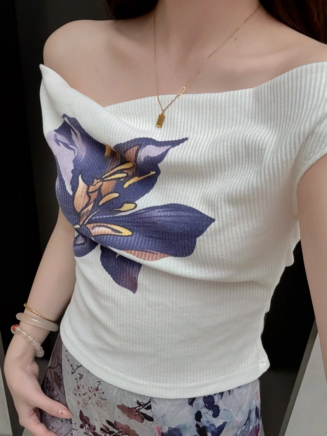 一位长相漂亮、身材出众的姑娘,穿上了一件对身材要求极高的紧身款一字肩粉色针织衫搭