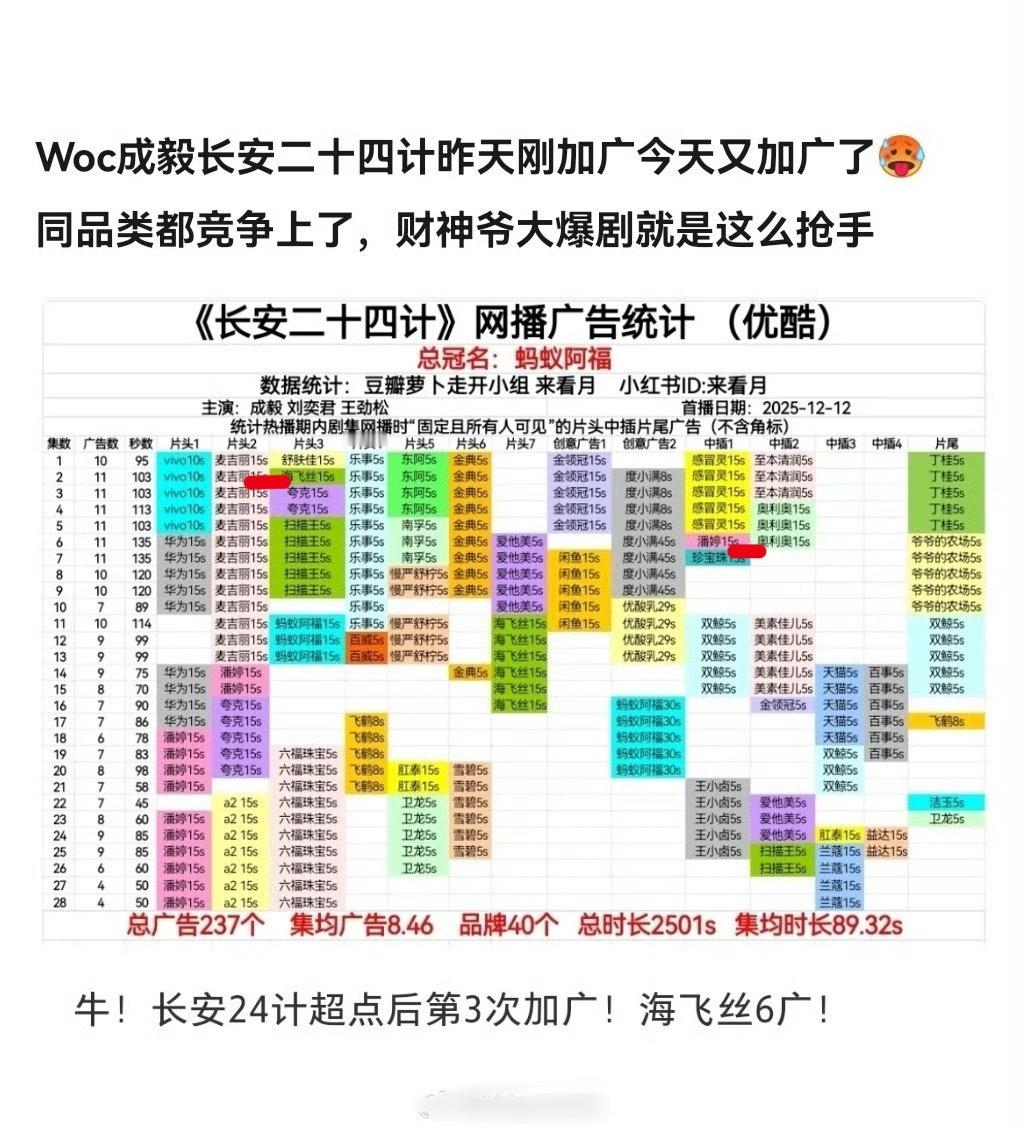 我来打假成毅粉丝吹得《长安二十四计》海飞丝潘婷加广!!你们看一下,这两个品牌是不是前面就投了?(划红线),那为什么现在又投?因为剧播放量热度太低撑不起曝光度,达不到品牌的投放要求,优酷只能给他们循环补量,不然交代不了,而这样操作,优酷是亏的,这种亏本补量的操作,明眼人都能看出剧有多扑!所以优酷连收官战报都不发,2025年年终总结里更是只字未提,连自家原创动漫都有夸奖,这部号称“招商爆款”的剧却被直接忽略,到底火没火,平台态度早就说明一切了! 扑了扑了!