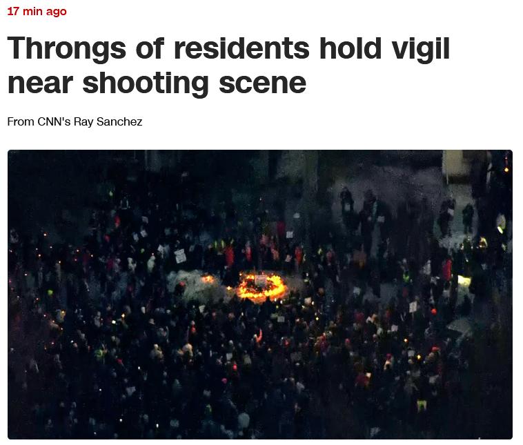 据报道,成群的明尼苏达州居民和活动人士在一片积雪上围成一圈,为一个由鲜花和蜡烛搭成的临时祭坛守夜,祭坛旁就是37岁的芮妮·妮可尔·古德数小时早前被一名移民与海关执法局(ICE)官员开枪致死的地点。他们高呼:“说一次,说两次,我们不会容忍ICE!” 一些人举着标语牌,上面写着“杀人的ICE滚出我们的街道”之类的话。演讲者表示,这些联邦官员的行为不可接受,是他们所谓的“军国化国家且缺乏问责制”的直接结果。他们呼吁对开枪致死该女子的ICE官员提起指控,并指出她当时是在观察联邦官员的行动。