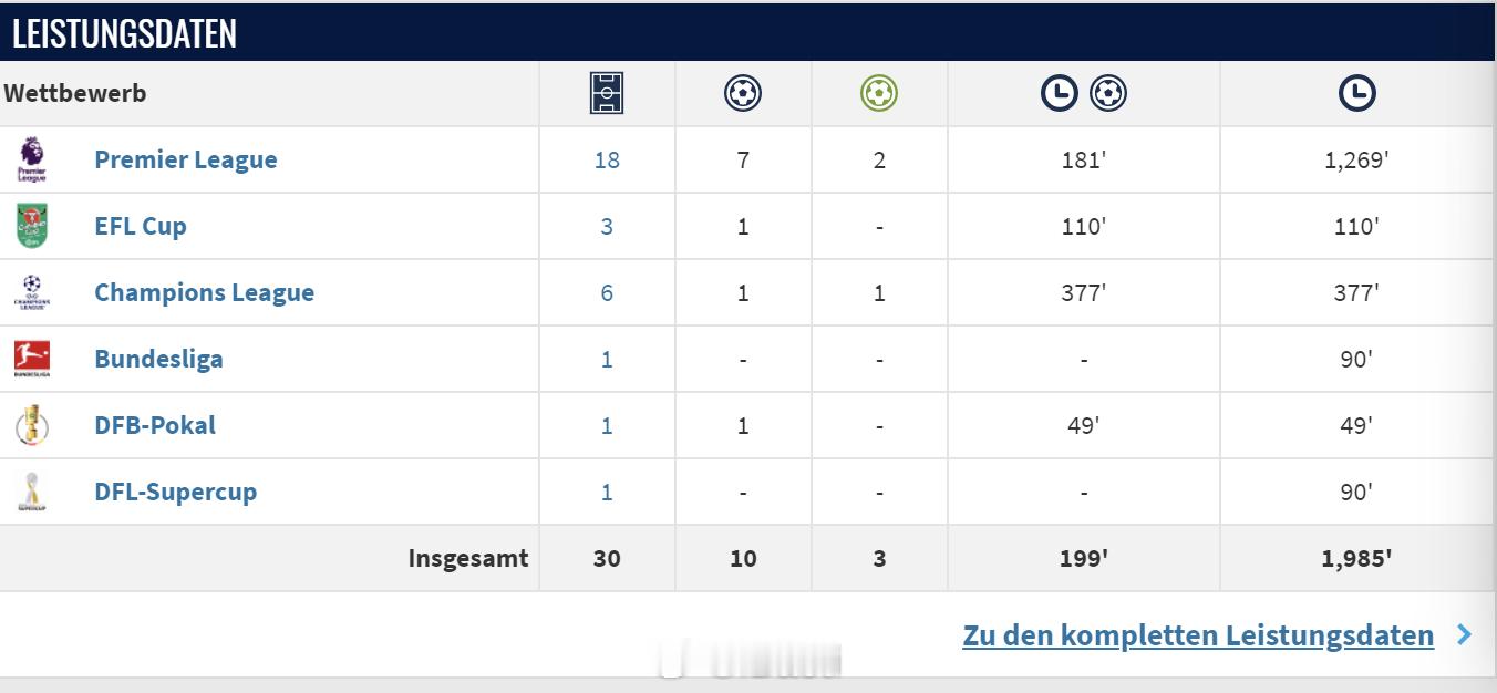 一看吓一跳,沃尔特马德这个赛季的俱乐部比赛居然已经来到整整30场了啊(这还没算他代表德国队踢了整整6场世预赛)……整个上赛季,他才为斯图加特踢了33场正式比赛(17球),而2023/24赛季则代表不来梅踢了30场(2球),而且首发次数少得多。他此前出场最多的一个赛季是2022/23赛季租借到德丙埃尔弗斯贝格期间的37场(代表埃尔弗踢了34场,还代表不来梅踢了1场,代表不来梅二队踢了2场)。不知道在没有冬歇期且赛程特别密集的情况下,他在赛季“下半场”还能否保持理想状态。