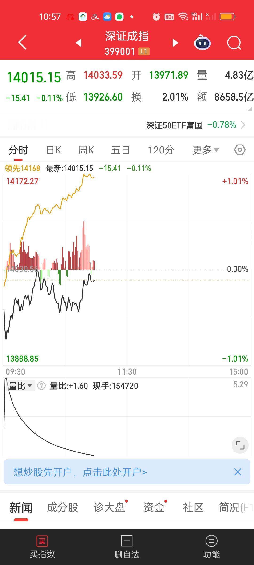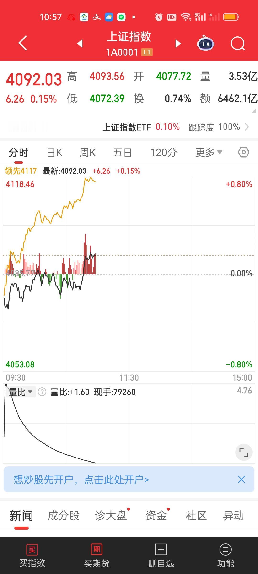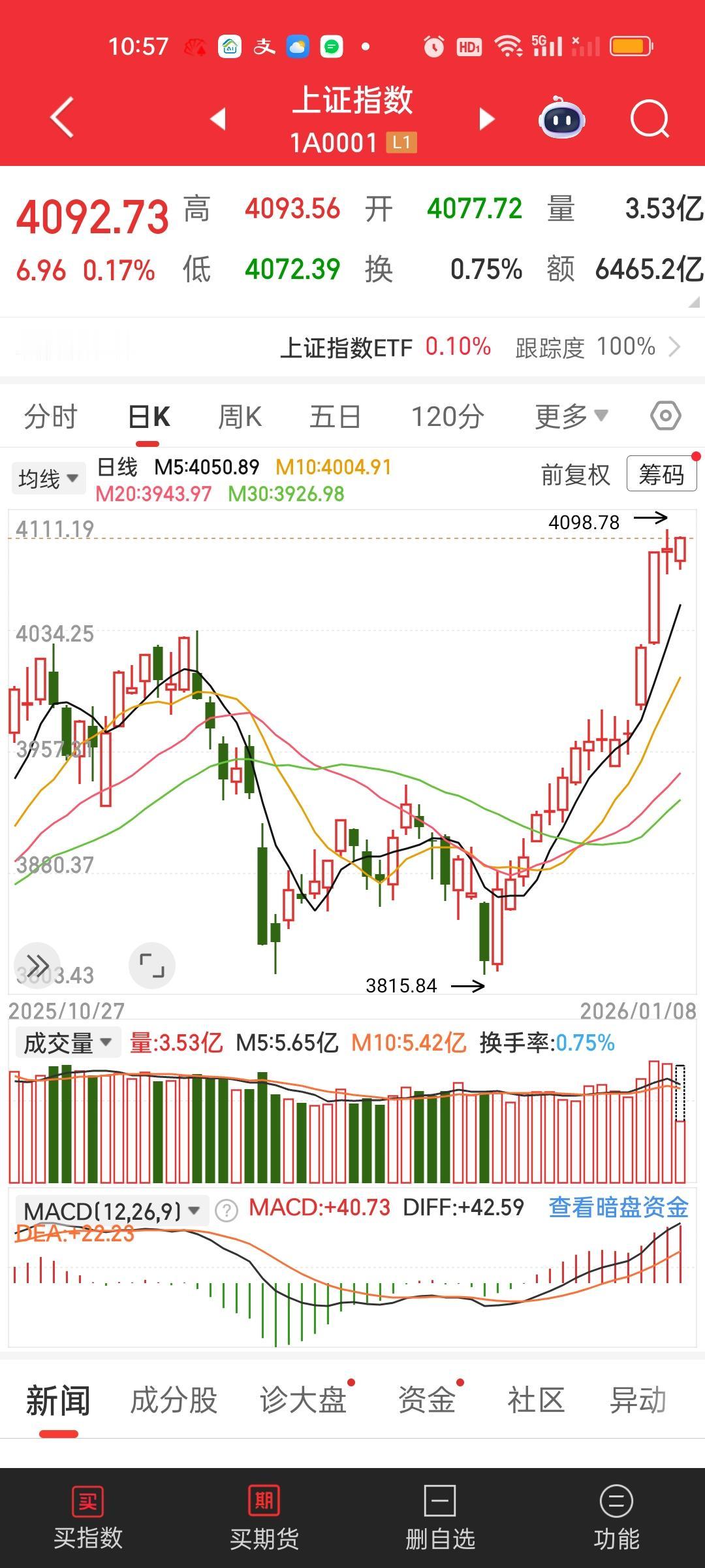 今天的量能缩的太厉害了,才不到一个半小时,已经缩量了1200亿,如果这样算,全天可能缩量超过3000亿,资金明显开始退潮了,进攻意愿显著下降。我们说成交量非常重要,因为哪怕是下跌,这个票在盘中的走势也会有一波二波三波的冲击,所以在成交量很大的情况下容错的空间也是很大的。成交量一旦下降,你会感觉每只票的上下波动明显降低了。 今天这个低开明显是为15连红做铺垫了,简单的说就是为了红而红,哪怕平开今天都极有可能收阴线。昨天收在4085.77,今天开盘4077.72,低开了8.05点,假如今天就4085点平开,大概率是要收阴线的。但4077点开,4078收都是阳线。是不是这样?