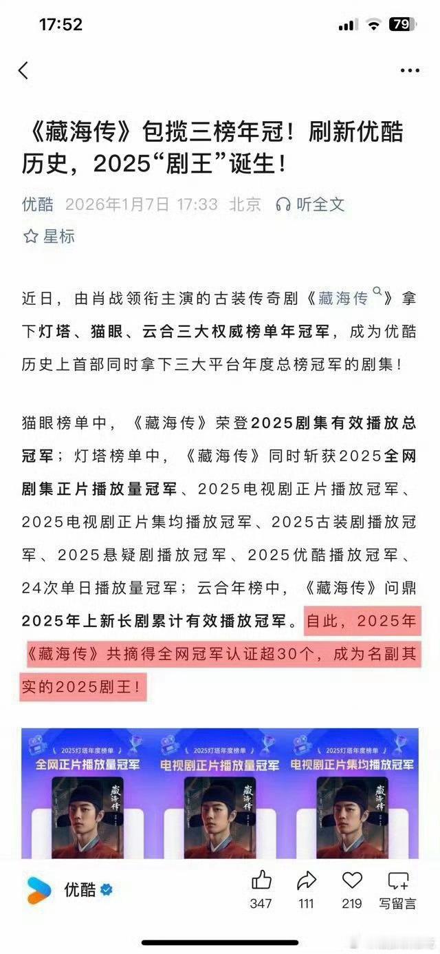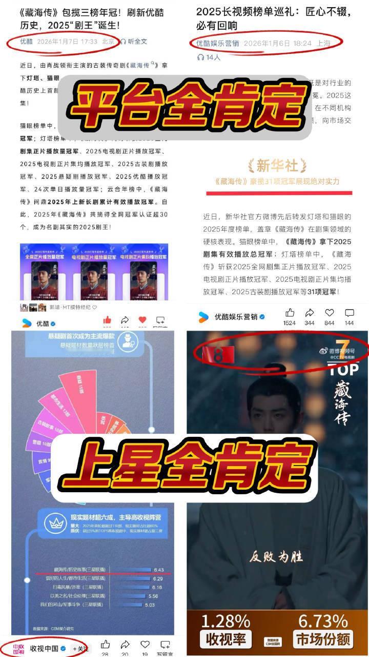 CCTV8收视前十《藏海传》用硬核成绩刷屏全网——CCTV、央视新闻认证入选央八收视前十,CCTV官博认证其为央八近五年古装剧收视第一,优酷直接盖章“2025年度剧王”,包揽灯塔、猫眼、云合三榜年冠,共拿下30个冠军。剧播期间很多热搜主持人都是人民日报,央视新闻,为什么主流央媒力挺《藏海传》?因为这部剧被当作文化名片向全球特别是向台湾地区输出,所以《藏海传》不止是国内爆款,这部剧更是国家级文化名片!与《哪吒》《黑神话:悟空》一同被主流央媒列为文化标签,通过Disney+覆盖全球190余国,IMDb 9.5分刷新中剧纪录,中国台湾地区连续52天霸榜,还打破韩国SBS25年采购纪录,让榫卯、昆曲等18项非遗美学火遍海外!