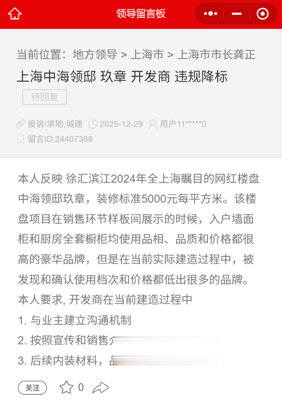 12月底,有人在领导留言板称领邸玖序存在“降标”问题,展示样板与实际用材之间存在明显落差。