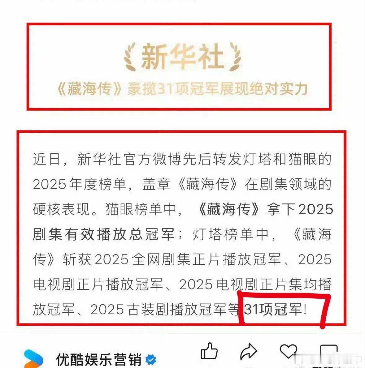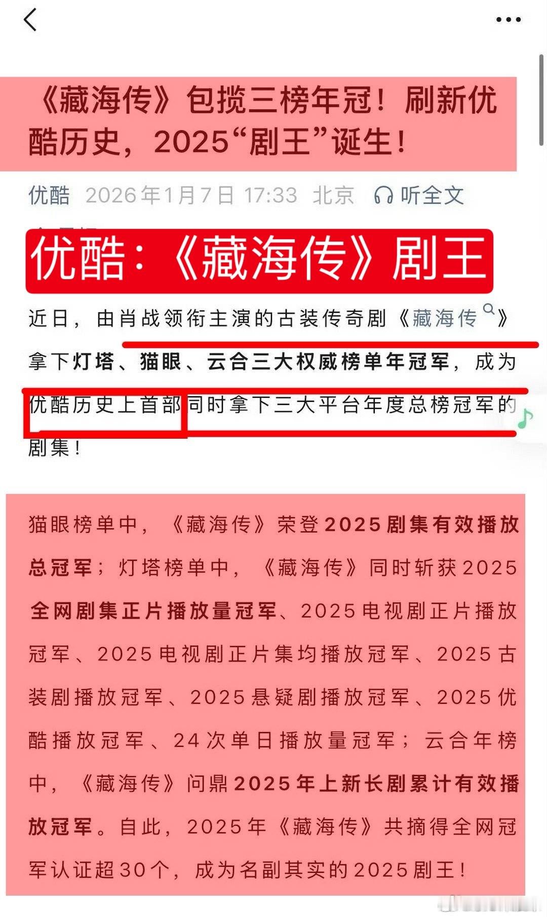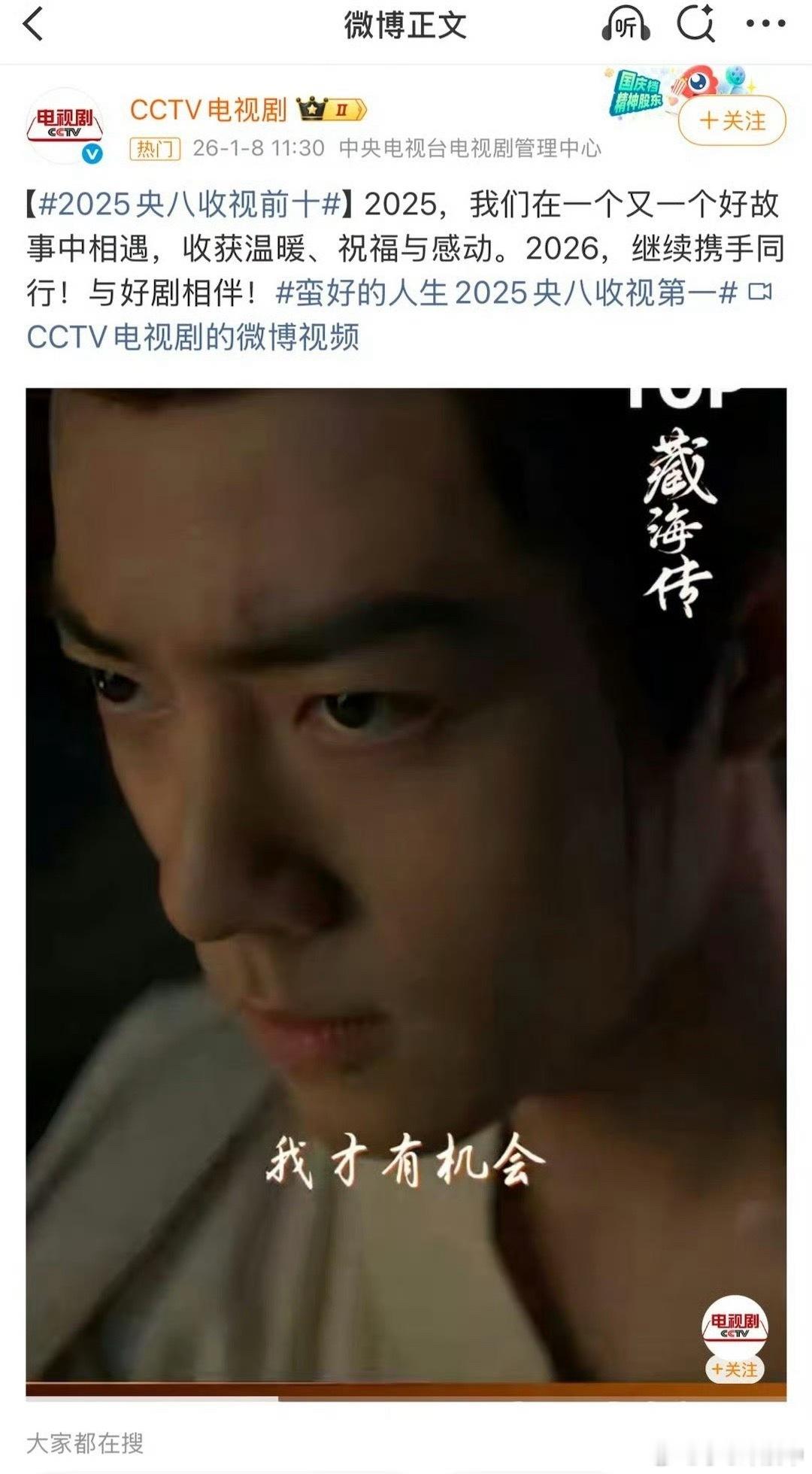 2025央八收视前十肖战藏海登顶2025年度角色年度剧王《藏海传》凭实绩霸屏全网,台网口碑三爆🔥CCTV、央视新闻双重认证其央八收视前十,更获央视盖章“近五年古装剧收视TOP1” 👏优酷👖认证“2025年度剧王”,强势包揽灯塔、猫眼、云合年冠🏆,狂揽31项冠军🏆。以中式美学为骨、权谋为魂,这部火爆全球的现象级热剧不仅创下多项纪录,更掀起全民二创热潮,成为2025年国剧标杆之作!国剧之光/文化标杆👏 优酷认证肖战藏海传2025剧王 CCTV8收视前十
