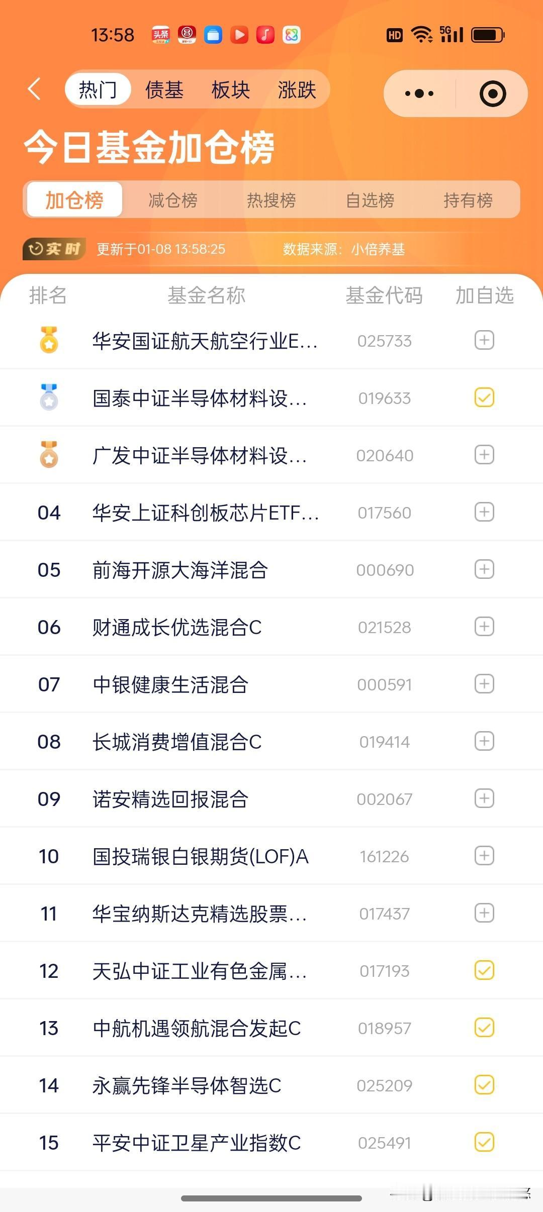 1.8日基金操作观点及加仓榜 目前大盘中短线技术指标呈多头排列,4100点附近要震荡整理一下,不可能深度回调,但是再大涨也不现实,元月份收阳线无疑。 目前就看主力是大阴线回调还是盘中回调! 当下主力就是轮番炒几个热点板块,你不敢追涨,账户也难涨上去,你看,卫星通信昨天歇一下今天又大涨。去年热门赛道cpo震荡不前,昨天涨的还没有今天跌的多。 本人观点还是看好科技,资源,新能源,高端制造等板块,不要去搞偏门,要与时俱进。 人形机器人,这两天指数涨,基金不涨,先持仓观望,不建议开新仓! 创新药,反转行情,持仓待涨分期低吸,大胆的也可追。 可控核聚变,每天都提示,上涨趋势,持仓待涨分期低吸或者定投。 半导体芯片,热门赛道之一,持仓待涨。 新能源板块,位置相对低位,持仓待涨,逢跌低吸。 cpo,板块指数上行趋势,但是几个热门基金估值下跌,只好耐心守住,不建议重仓参与。主力资金不在这里。 软件板块,上行趋势,位置相对低位,持仓待涨,逢跌加仓。 中证传媒,创阶段新高,持仓待涨。 动漫游戏,持仓待涨逢跌加仓。 军工板块,上涨动能不减,继续持仓待涨,重仓的叶可以分期止盈。 北证50,突破了半年线压力,持仓待涨,逢跌加仓。 .. 看后不忘点赞关注投资理财不迷路。
