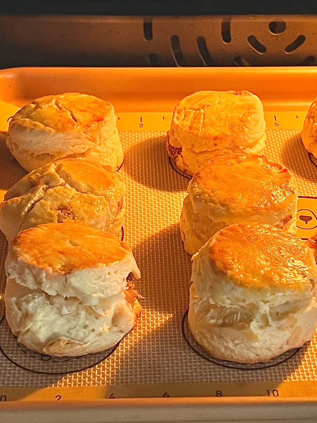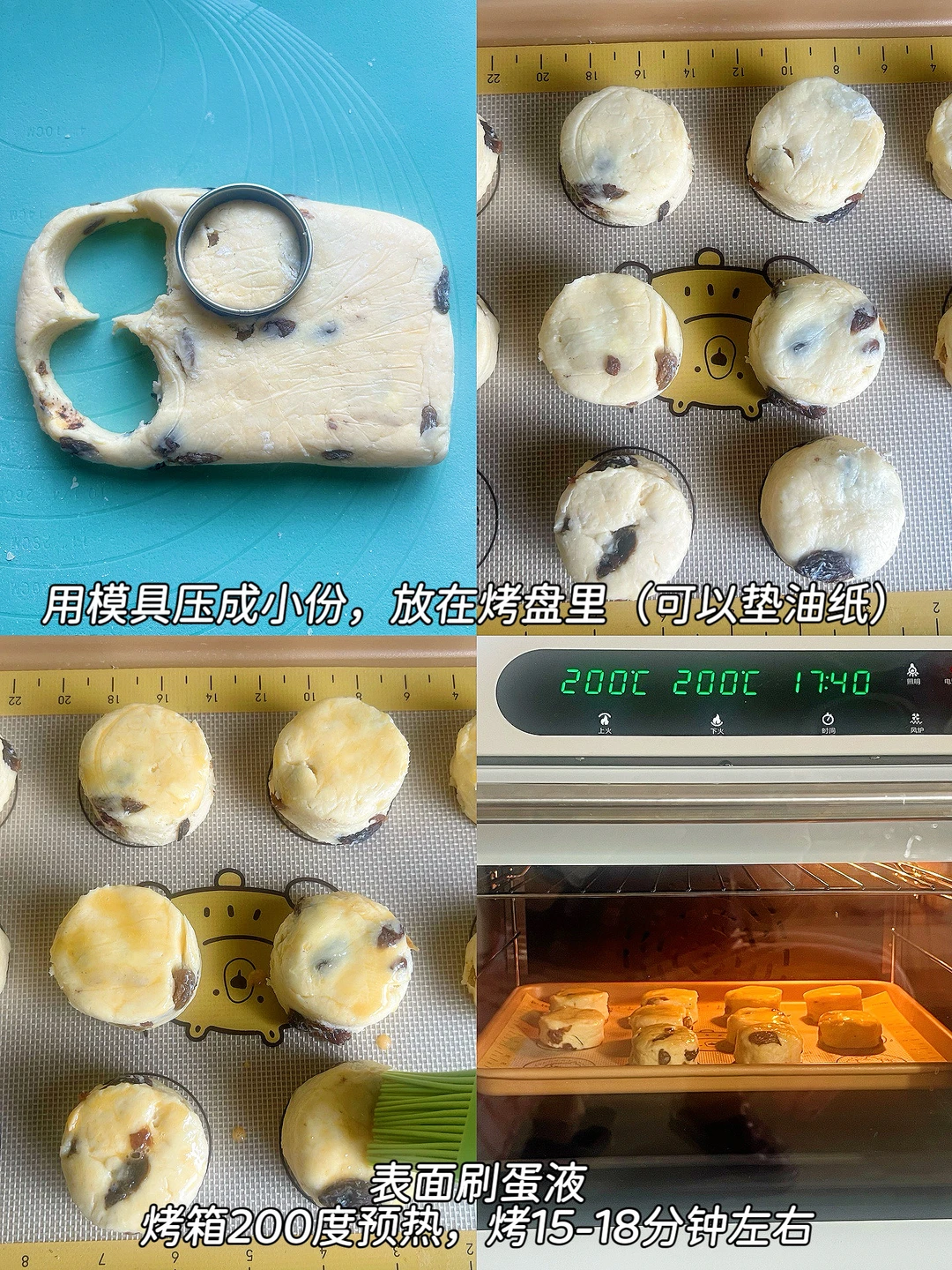 5️⃣用模具压成小份,放在烤盘里(可以垫油纸),表面刷蛋液,烤箱200度预热,烤15-18分钟左右,表面色泽金黄即可