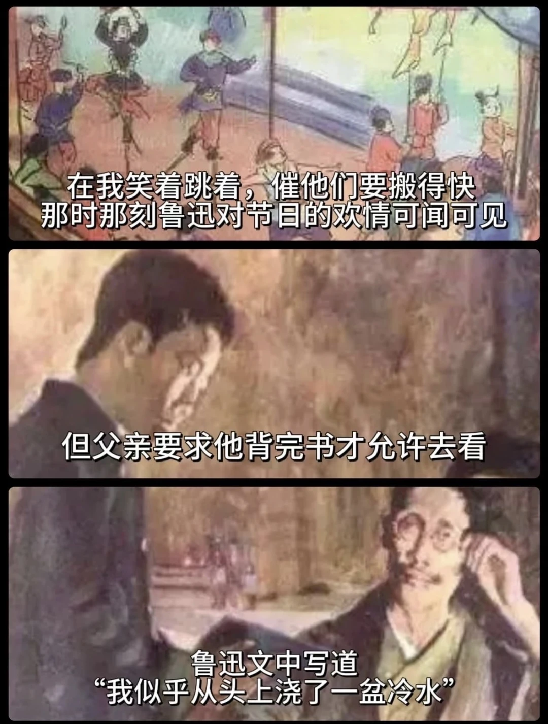 他描述了自己儿时对节日的渴望,却被父亲要求背书才能去玩。尽管他最终背完了书,但那份期待和快乐已经消失,那份被冷水浇灭的热情,那份最终的失望,兴致也没有了,只有少年那无法弥补的遗憾。