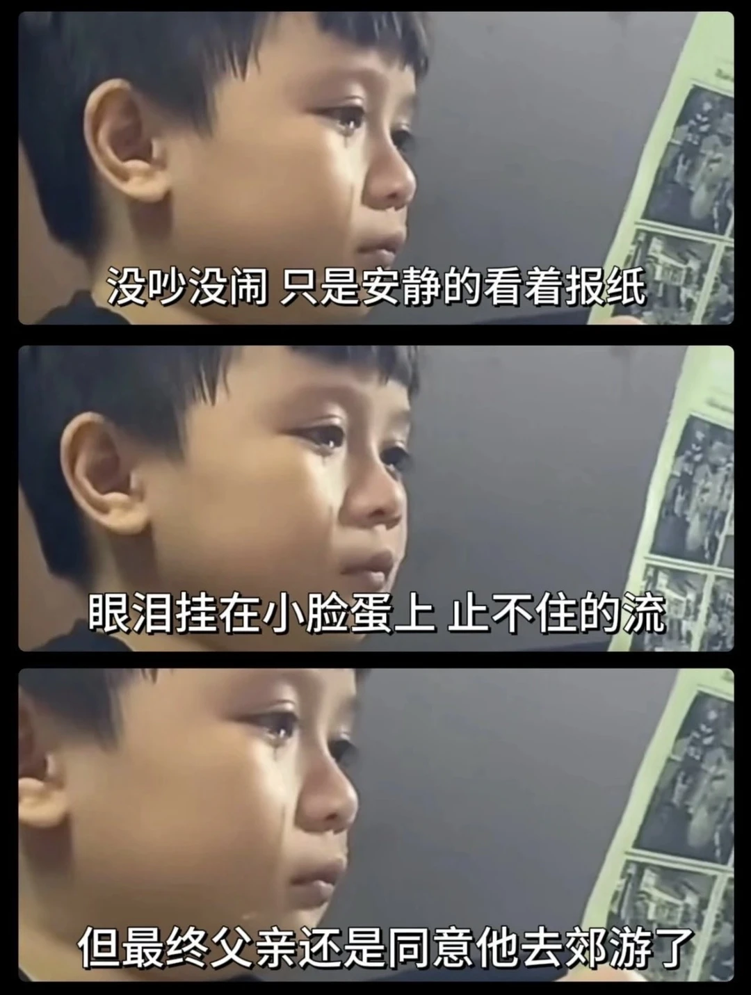 最近有一个让人心碎的片段:“一个小男孩,因为爸爸不允许他参加学校的郊游,静静地哭了一个小时。他没有大声抗议,只是默默地流泪。最后,爸爸心软了,同意他去。但那一刻,孩子的快乐已经被泪水冲淡,去与不去,似乎已无分别。”