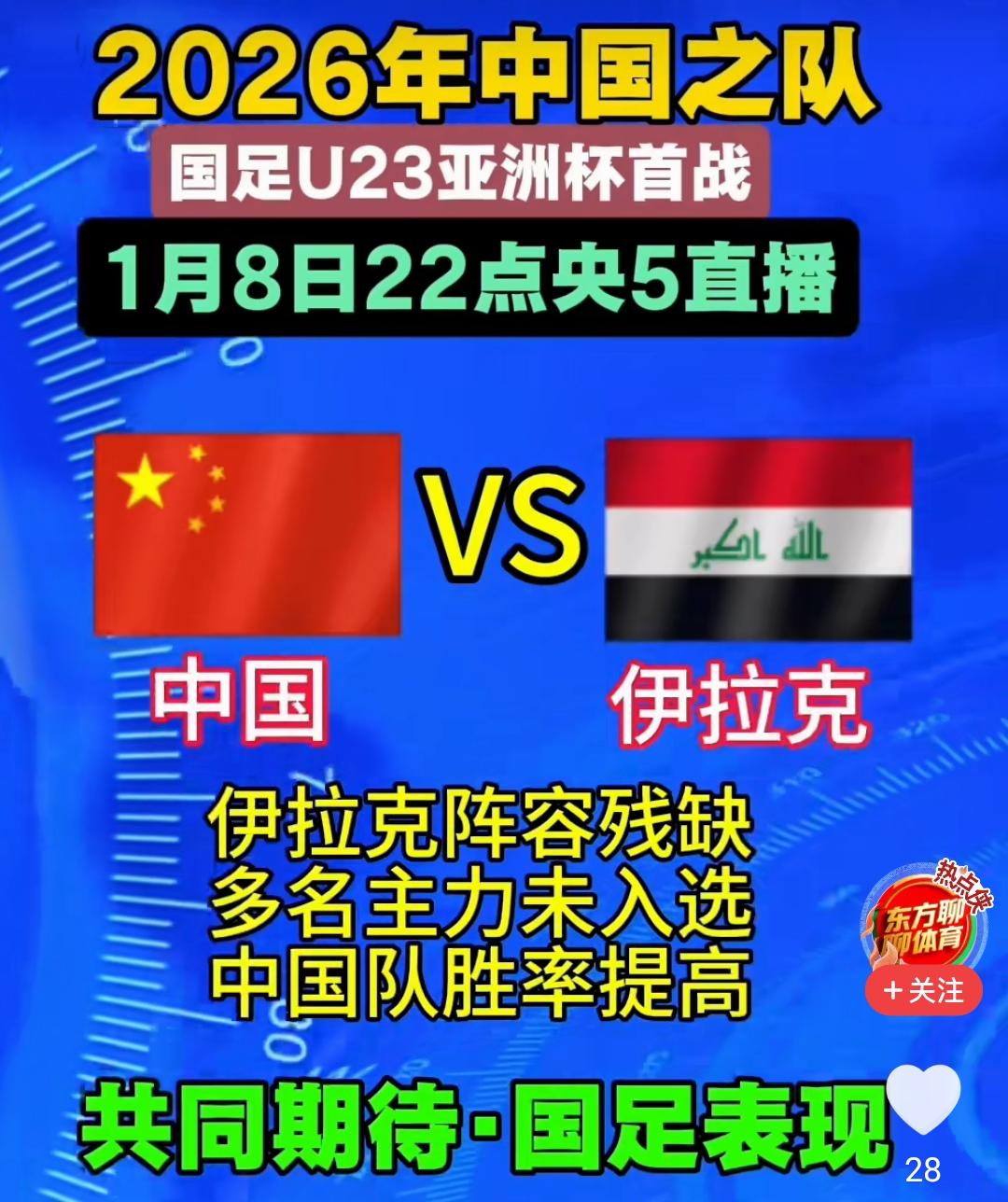 中国U23队亚洲杯小组赛首战D组伊拉克,首战如同生死战,需要在对阵伊拉克U23队比赛中拿分 冬日生活打卡季 2026年1月8日22:00在沙特举办U23男子足球亚洲杯继续进行比赛,按照已经安排时间,在晚上10点将进行D小组第1轮比赛,对阵双方:伊拉克U23队vs中国U23队,比赛球场:法赫德王子体育场,转播平台:CCTV5、央视体育客户端、央视频、爱奇艺体育、奇异果TV、咪咕视频。 沙特亚洲杯小组赛中国U23队被分在D组将与同组伊拉克、澳大利亚和泰国分在同一小组,小组前两名可以晋级八强,D组可以说是名副其实的“死亡之组”。中国队此前5次参加U23亚洲杯,均未能从小组赛出线。本次出征沙特亚洲杯需成绩要有所突破,争取小组赛出线成为唯一目标。 中国U23队以848万欧元的总身价排名在所有参赛球队第三名,当然这样排名对于我们来说是毫无意义可言,重要的是中国U23队必须在D小组突出重围力争小组出线。中国U23队的平均年龄约为21.75岁,处于整体中游区间。 在2026年1月8日,出席对阵中国U23队的赛前新闻发布会时,伊拉克U23队主帅埃马德·穆罕默德表示,球队人员不整,有不少出生于2005年的球员,这无疑对于中国U23队来说是利好消息,不过伊拉克依然是亚洲的强队之一,中国U23队需要摆正姿态准备迎接新年第一场比赛,我们用一场久违的胜利给自己开一个好的兆头! 在2025年熊猫杯比赛中中国U22队使用过多个阵型,使用过的阵型:4-2-3-1、5-3-2,当然这需要在赛前根据对手的实力来进行正确分析,尽可能使用最强最佳方案,力争在比赛中做到不出致命错误,全力以赴控制做好自己攻防两段节奏,快中求稳,全力以赴争取胜利,确保开门红! 赛前预测中国U23队对阵伊拉克U23队首发阵容如下: 门将:李昊 后卫:胡荷韬、吾米提江、贺一然、鲍世蒙、杨希 中场:蒯纪闻、李镇全、王博豪 前锋:拜合拉木、王玉栋