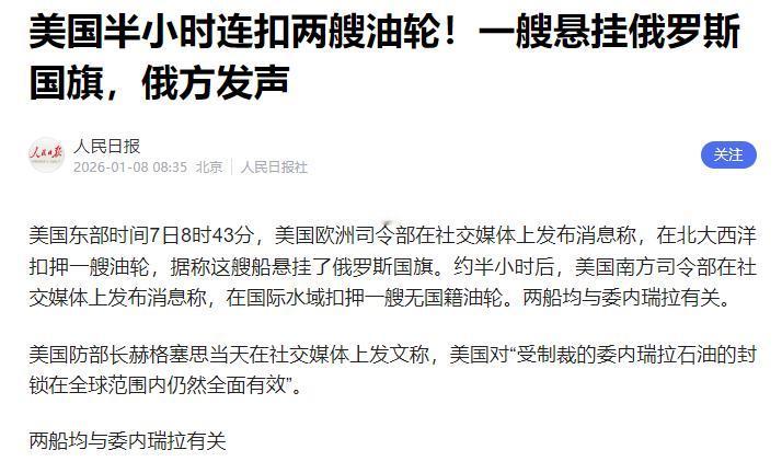 美国疯了,世界对美国已毫无办法了! 1月7日,美国在半个小时内扣押了两艘油轮,其中一艘是俄罗斯油轮,另一艘是在国际水域的无国籍油轮。 据悉,被扣押的“水手”号原名为“贝拉1”号,早在2025年12月就遭到了美国海岸警卫队的持续追踪,期间油轮为寻求合法保护,更改船名并悬挂俄罗斯国旗,却仍未能躲过美国的围堵。 此次扣押行动并非美国单方面所为,英国国防部已证实,英军为美国扣押俄罗斯油轮的行动提供了基地保障等支援,北约多国也在此前对该油轮展开了密集监控,这背后显然是霸权阵营的协同作恶。 面对国际社会的潜在质疑,美国不仅毫无收敛,反而摆出一副理直气壮的姿态。 美国国防部长赫格塞思当天就发文宣称,美国对“受制裁的委内瑞拉石油的封锁在全球范围内仍然全面有效”,直白地暴露了此次扣押行动的真实目的——为了维护对委内瑞拉的石油禁运,肆意践踏国际规则。 美国国务卿鲁比奥更是毫不掩饰地炫耀这种霸权,称正是因为对委内瑞拉的石油禁运,让美国获得了“巨大的影响力”和“控制权”,言下之意,只要美国不允许,其他国家就无法正常开展石油贸易。 对于美国的霸权行径,俄罗斯方面第一时间作出了强烈谴责。俄罗斯交通部明确指出,根据《联合国海洋法公约》,公海水域享有航行自由,任何国家都无权对其他国家管辖范围内的船舶使用武力。 俄罗斯外交部也紧急发声,要求美国确保油轮上俄籍公民的人道待遇,保障他们顺利返回家园。俄联邦委员会宪法委员会主席克利沙斯更是直接点破,美国的这种行为就是公然的海盗行径,完全遵循着美方臭名昭著的“单边规则”,严重违反国际法准则。 事实上,这已经不是美国第一次凭借军事和霸权实力,在国际海域肆意妄为。此前美国就曾多次以“违反制裁”为由,扣押其他国家的油轮,甚至没收船上货物。而此次在半小时内连续扣押两艘油轮,更是将其霸权主义推向了新的高潮。 更令人无法接受的是,美国白宫还放出话来,称被扣油轮上的船员可能会被带到美国接受审判,这种将本国法律凌驾于国际法之上,随意管辖国际海域事务的做法,简直是荒蛮至极。 面对美国这般毫无底线的霸权行径,国际社会除了谴责似乎别无他法。联合国海洋法公约的相关规定在美军的坚船利炮面前形同虚设,各类国际组织的调解也难以撼动美国的霸权野心。 无论是外交抗议还是经济反制,对于美国这样的超级霸权国家来说,都难以形成实质性的约束。这也正是最令人无奈的地方,当一个国家完全无视国际规则,仅凭自身实力肆意妄为,世界范围内的非军事手段似乎已经对其失去了任何约束力。 美国此次连续扣押油轮的行为,无疑给本就动荡的国际局势又添了一把火。它不仅严重破坏了国际航运秩序,加剧了国家间的紧张关系,更让全世界看清了单边主义的危害。 而当霸权凌驾于规则之上,没有任何一个国家能独善其身。这样的霸权行径何时才能停止?当非军事手段无法约束美国的野心,世界又将走向何方? 这值得每一个热爱和平、坚守正义的国家和人民深思。
