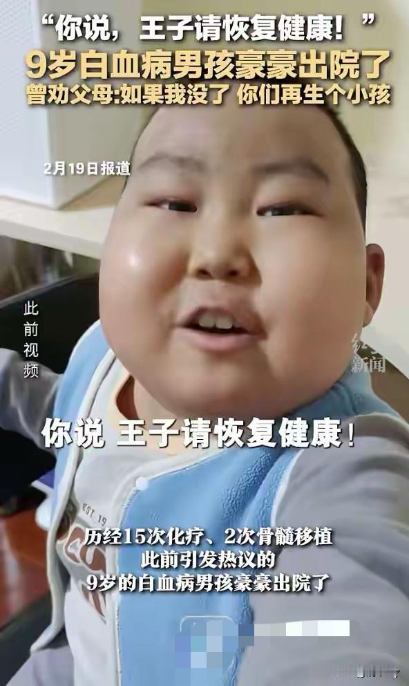 王子 请恢复健康!永不复发!那个满脸稚气的豪豪,那个每天都笑一笑的豪豪!最近病情有点恶化! 豪豪爸爸拒绝了所有好心人的捐款,他说不想再消耗大家伙的爱心了!他和妻子就想静静的陪伴着孩子!想让孩子留下最后的体面和光亮! 豪豪今年10岁,他四岁的时候患上了急性髓系白血病,经过了17次化疗,两次骨髓移植!受尽了痛苦和折磨,但豪豪依旧保持着乐观的精神! 豪豪爸爸说,孩子现在的病情就像根弦一样,随时可能会突然断掉!医生也说,再用昂贵的药物,也只会给孩子增加痛苦! 连续几年,一直都在默默的祝福这个小王子,没想到病情又恶化了!还是默默地为你祝福,希望有奇迹出现!加油小王子 请恢复健康! 王子 请恢复健康!