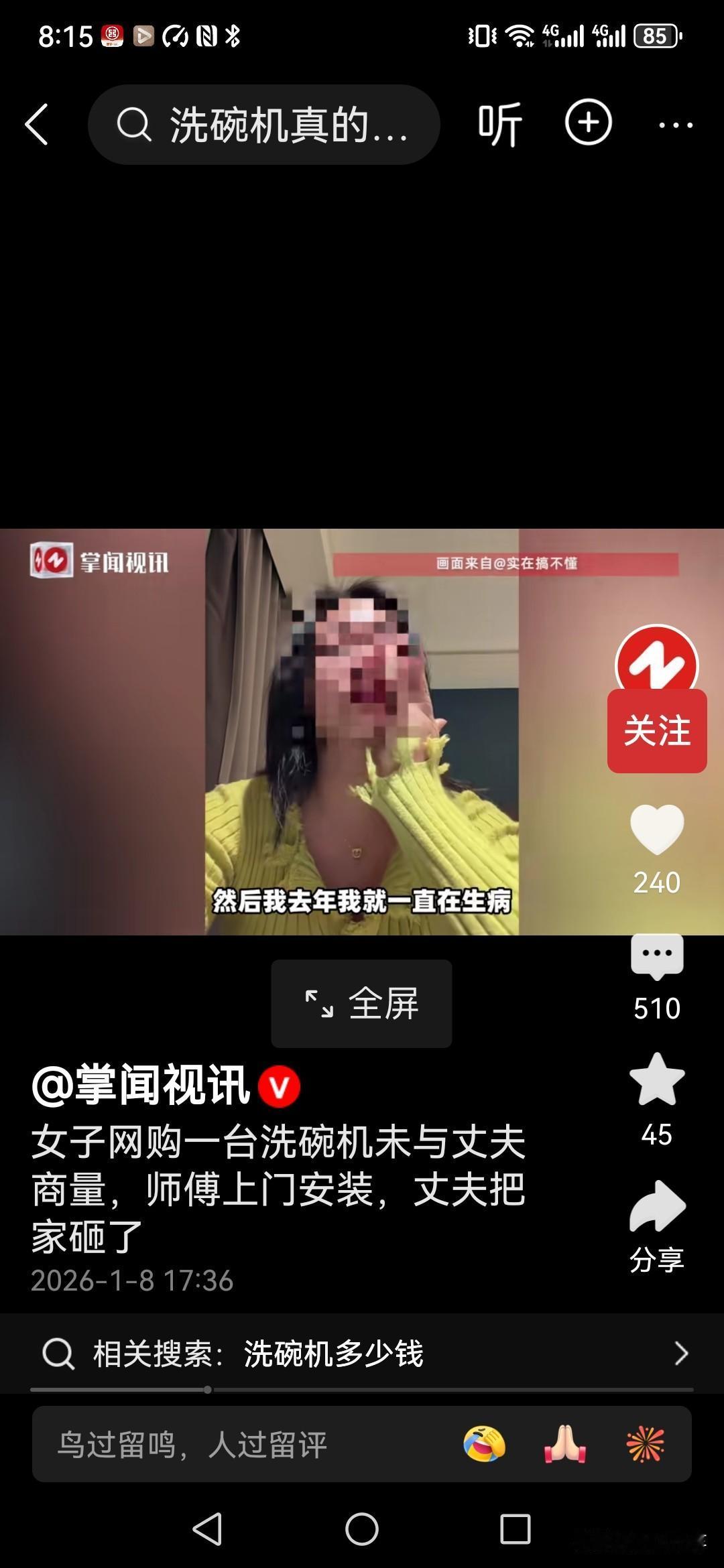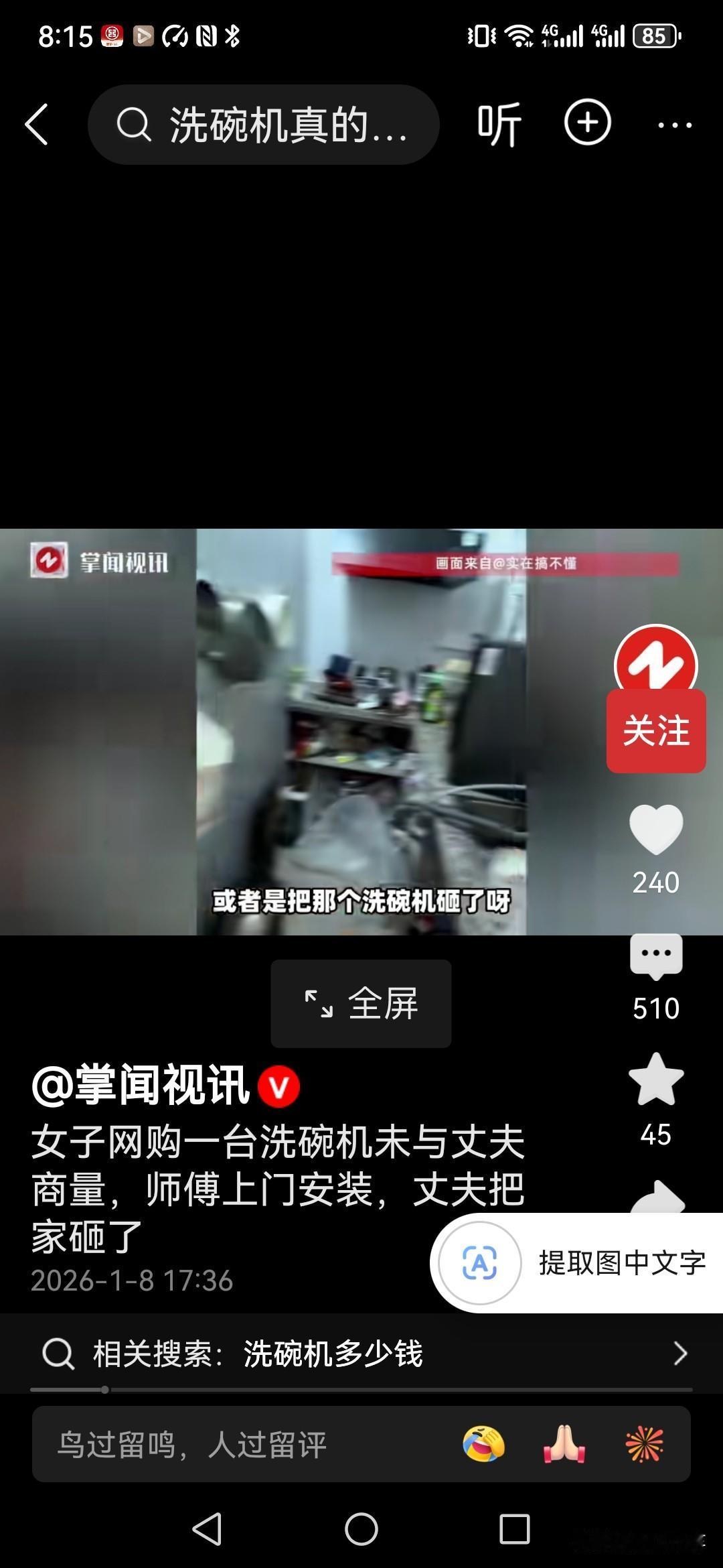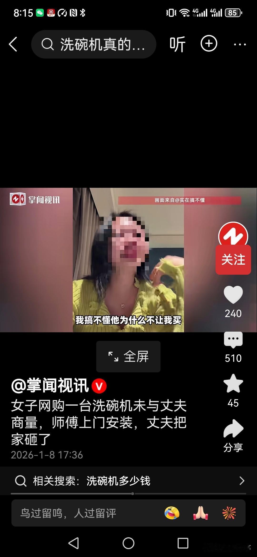你永远不知道成年人的崩溃会在什么时候爆发,广州一位女子哭着发视频述说自己家庭的遭遇! 她因为身体不太好,就带着两个孩子在老家,没有工作,丈夫在广州工作,每月收入1万以上。 今年老公让她带孩子一起到广州来生活,最近她购买了一台洗碗机!五六千的样子! 谁知道,送货上门后丈夫死活不同意师傅进门,最后女子担心丈夫和师傅动手,只能把丈夫拉开,让师傅把洗碗机先送进来,安装的事情以后再说! 结果,师傅走后,丈夫突然崩溃了,把家里客厅全部砸了! 女子不明白,是不是因为丈夫嫌弃自己没工作,不赚钱,但是丈夫也从来没有流露过这种意思, 她不明白,为什么丈夫会突然崩溃,所以才在网上哭诉! 那么大家觉得是怎么回事呢?平时好好的男人怎么就突然崩溃,把家给砸了,这是不想过了吗?
