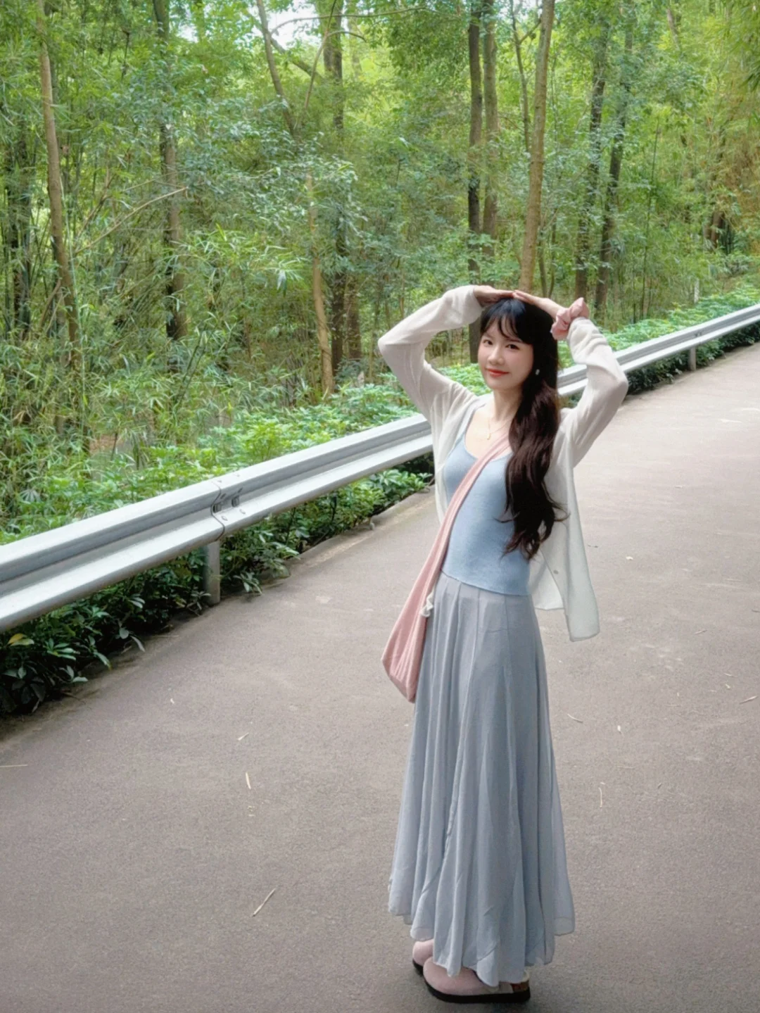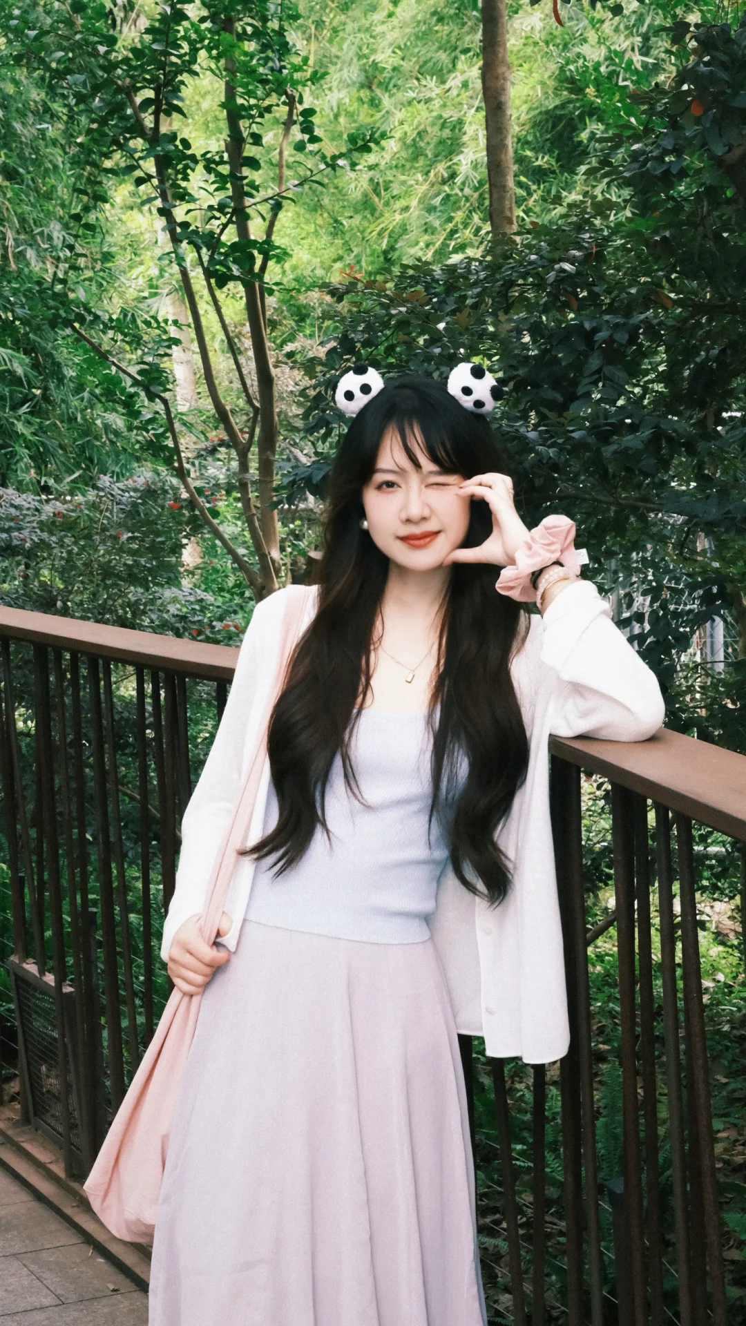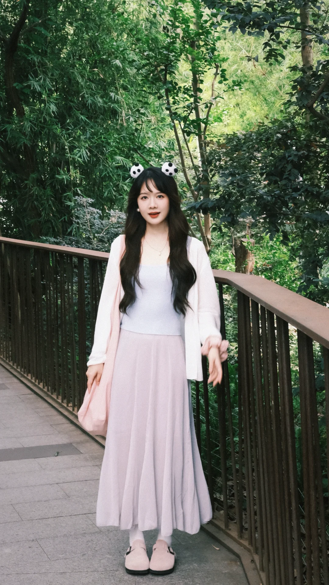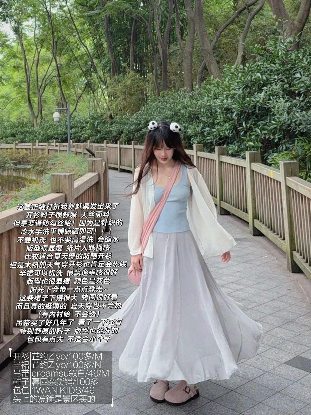 168/107左右 上个月去了一次熊猫基地 太热了太热了 熊猫根本不出来 没有看到花花 好遗憾🥲 打算天冷一点再去一次 今天是低饱和度灰粉蓝 很舒适显瘦的一套 纸片人既视感 白色开衫➕低饱和度马卡龙色系的吊带➕灰色半裙 很适合淡人的一套 也很适合通勤上班穿 比较舒适~