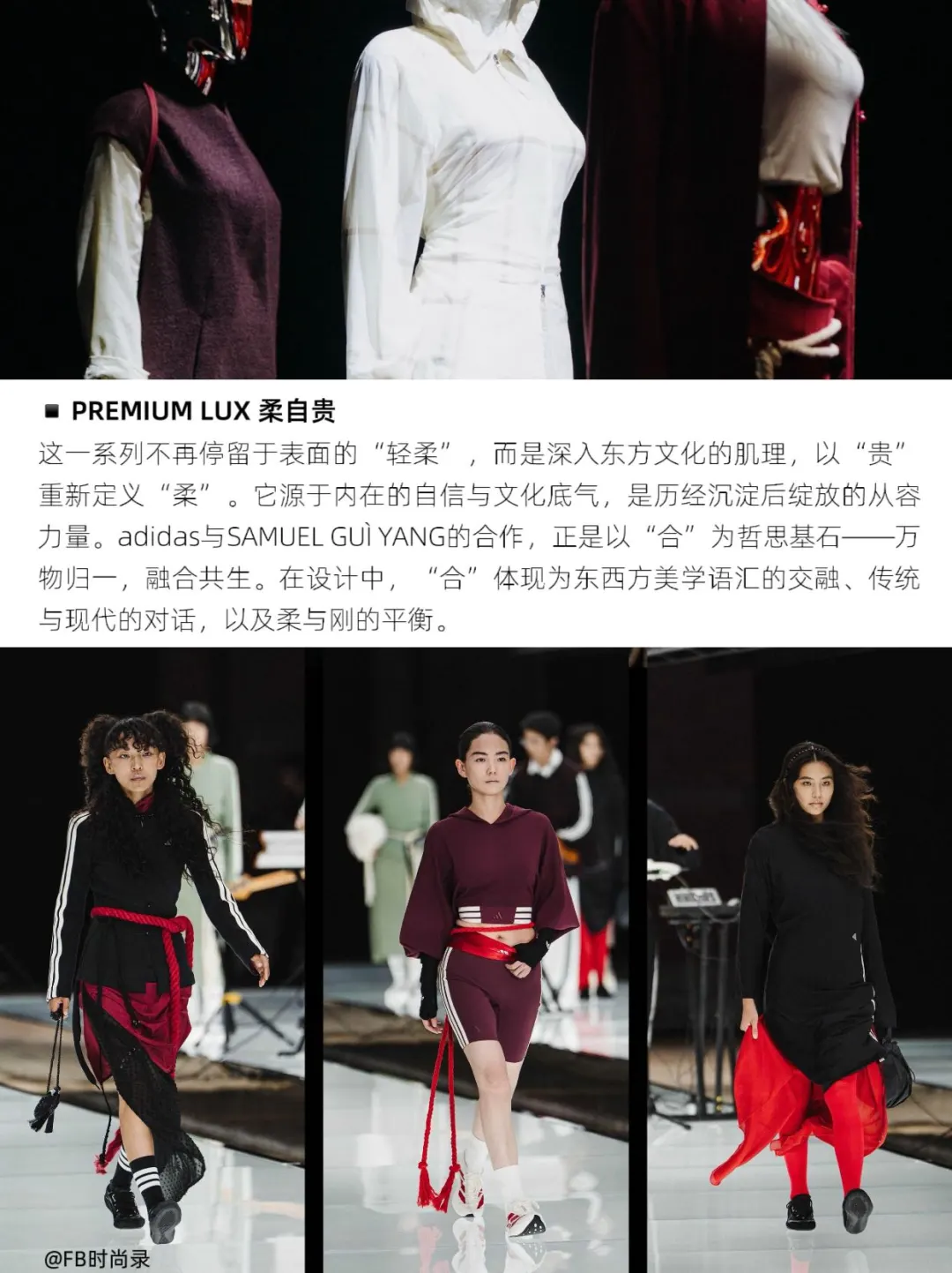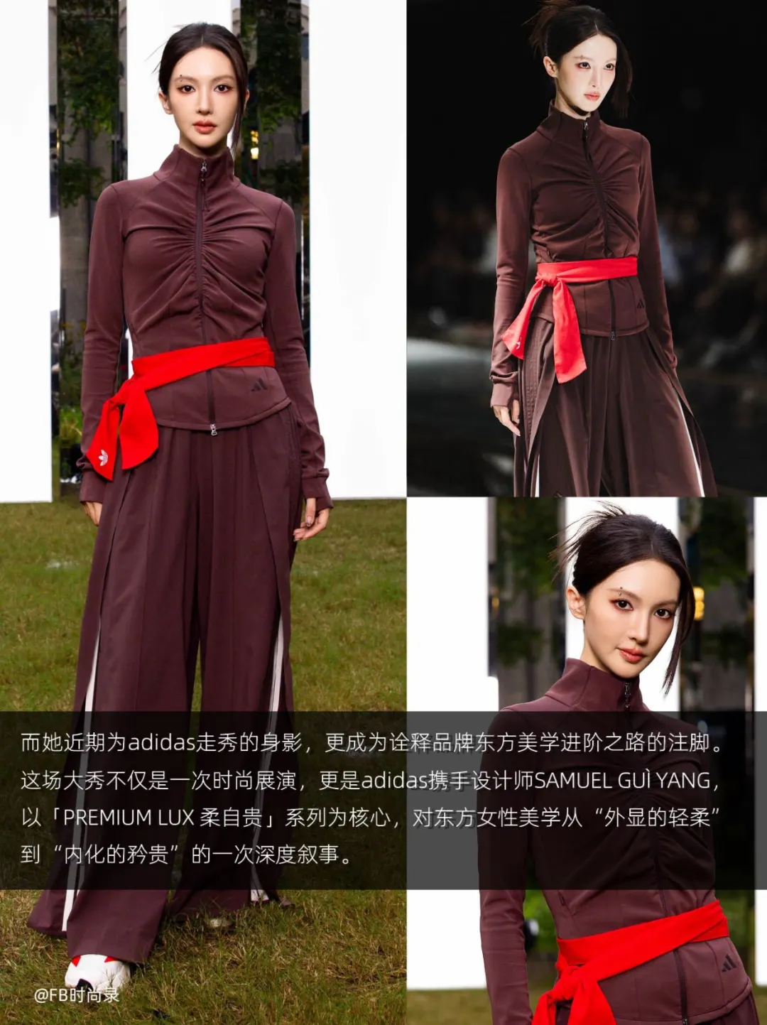 她近期为adidas走秀的身影,更成为诠释品牌东方美学进阶之路的注脚。这场大秀不仅是一次时尚展演,更是adidas携手设计师SAMUEL GUÌ YANG,以「PREMIUM LUX 柔自贵」系列为核心,对东方女性美学从“外显的轻柔”到“内化的矜贵”的一次深度叙事。