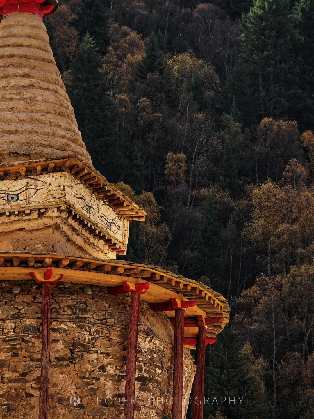 👉石刻大藏经围成的区域内坐落着32座大小不一的佛塔,斑驳残缺的外墙昭示着明清以来的漫长历史,据僧人说每座大塔内部都藏有经书、佛像和壁画,目前只有核心的【降妖塔】可进入,最高的【吉祥多门巨塔】所绘的佛眼最为传神