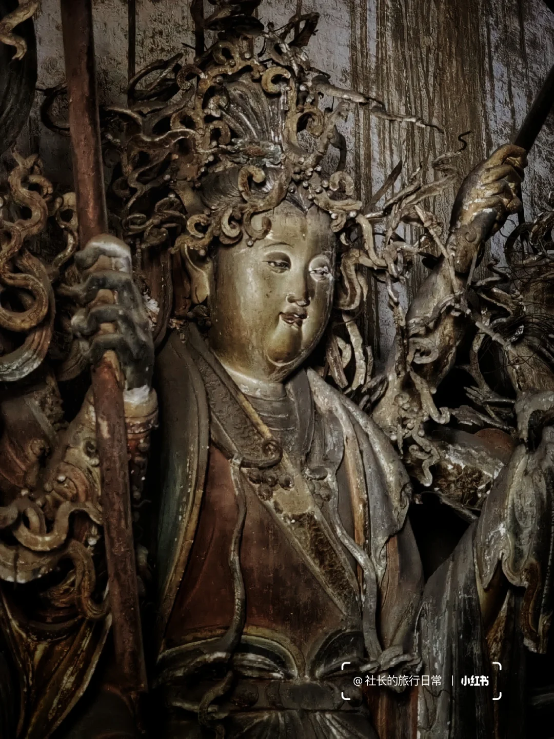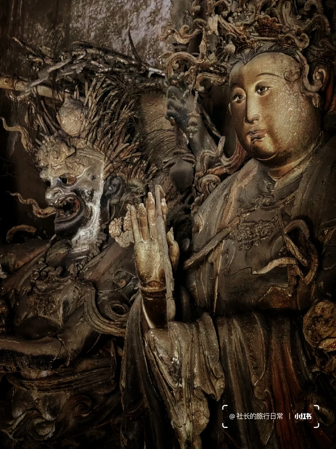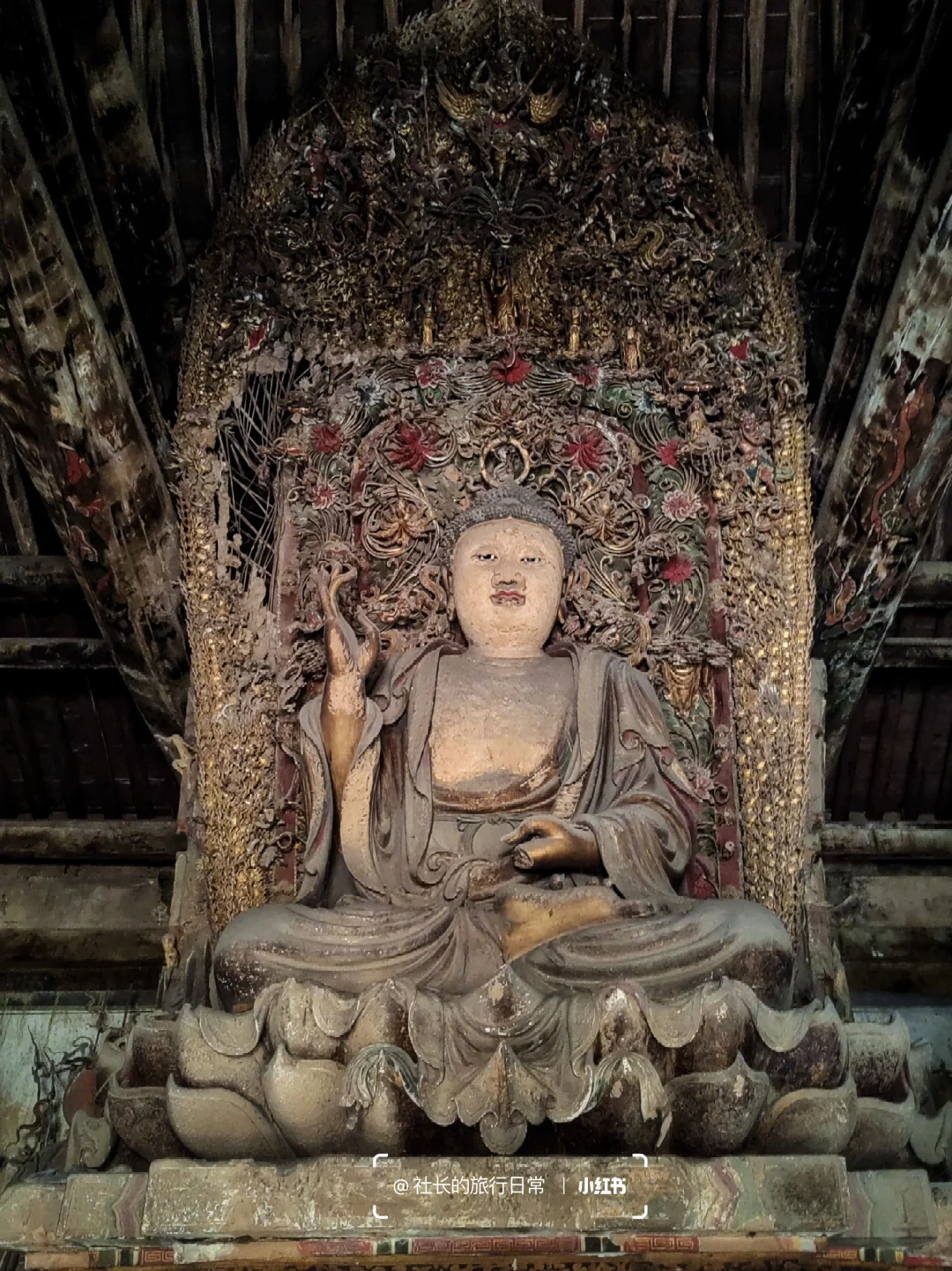1⃣二十四诸天像太精彩,以至于大家经常忽略大殿正主,如今释迦牟尼像背光依旧精彩,但周身金箔已被剥刮,二位菩萨造像的头部也已遗失,让人遗憾