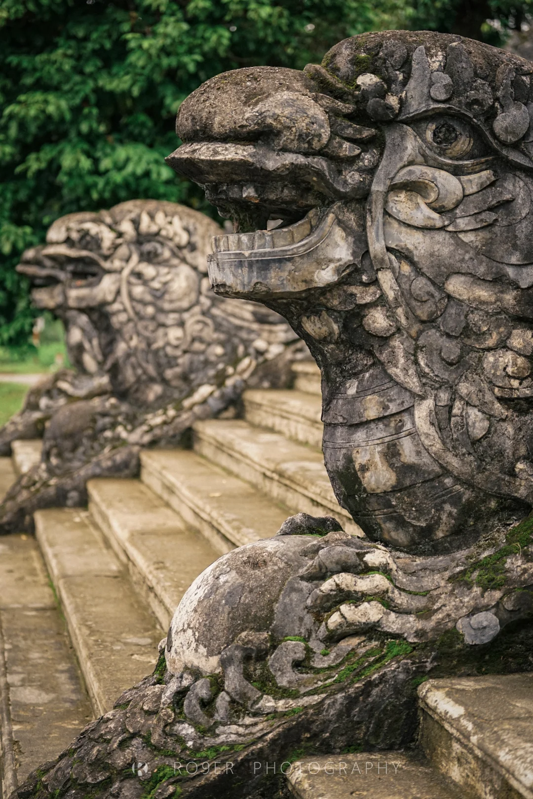 最远的一座,实际是阮朝第一位皇帝与皇后的合葬陵,其神道和石像都保留了阮朝陵墓早期的古朴粗犷风格,周遭自然风光开阔肃穆,人工雕琢感较弱