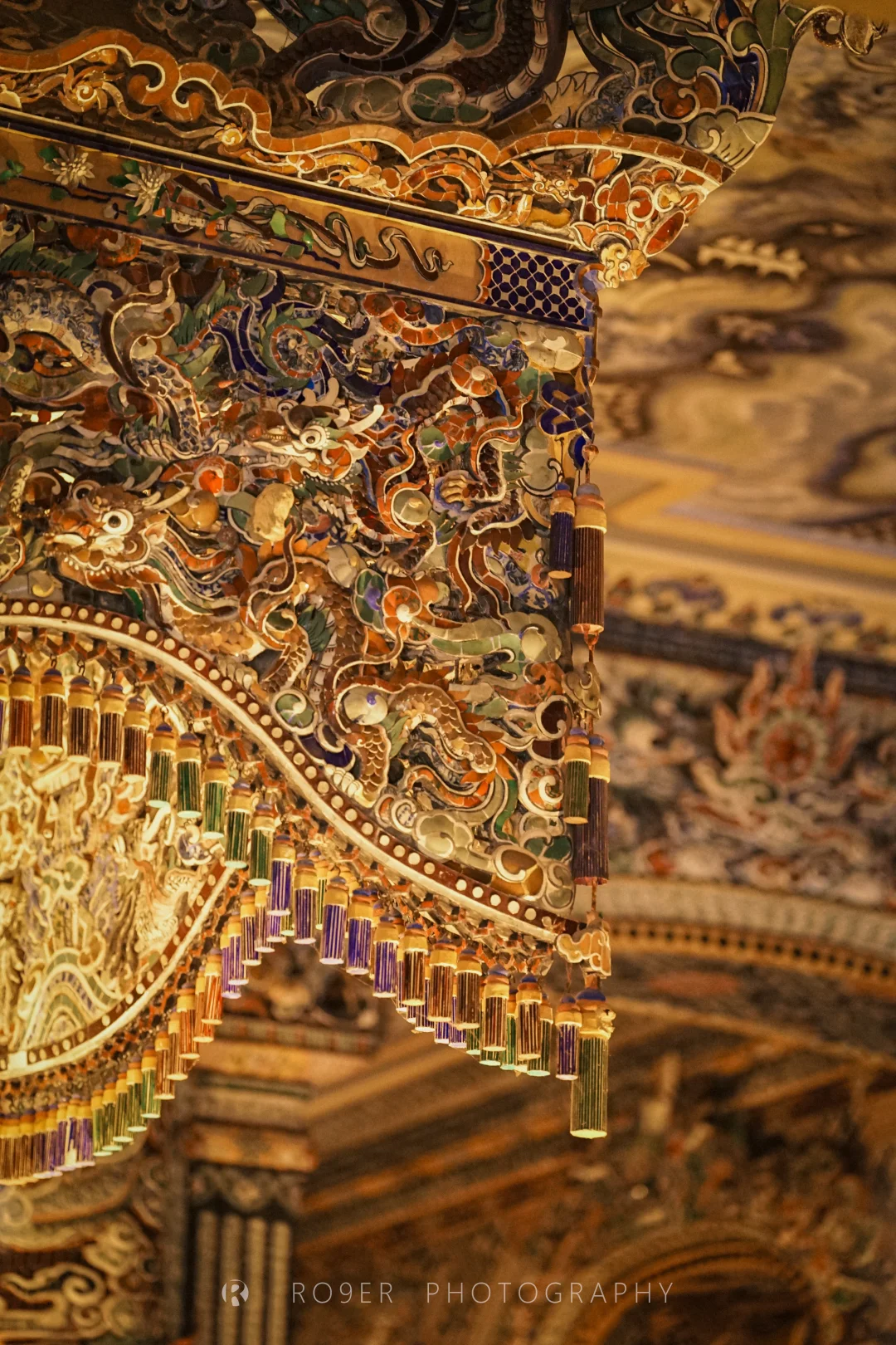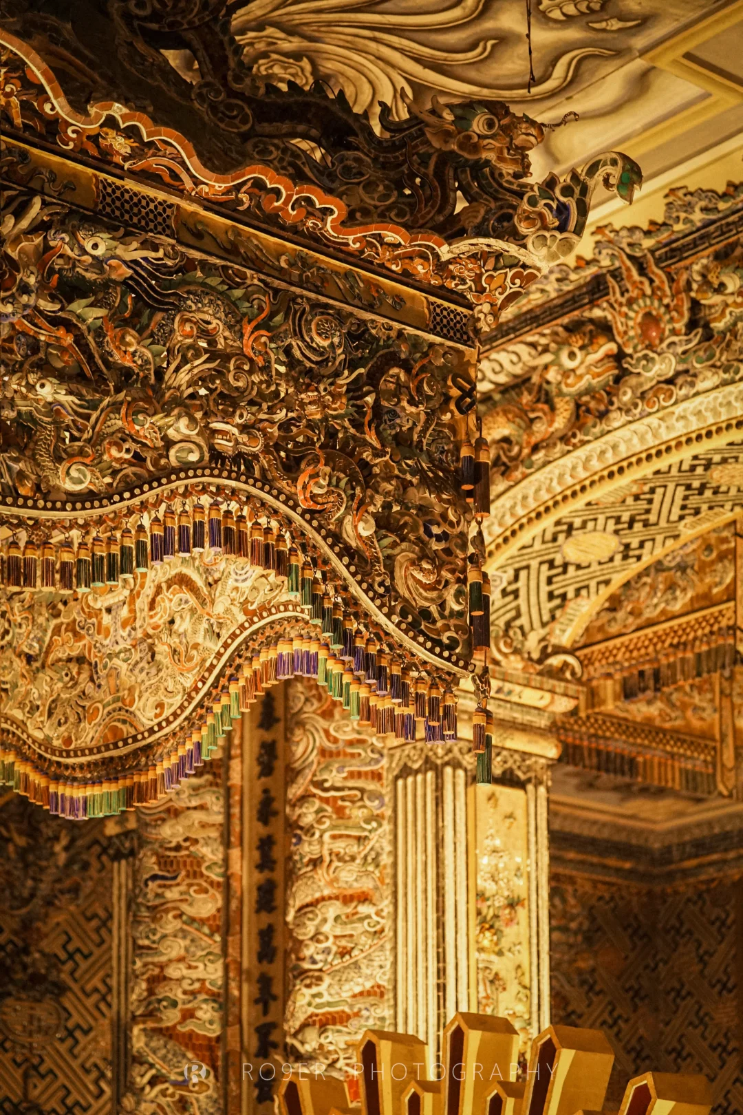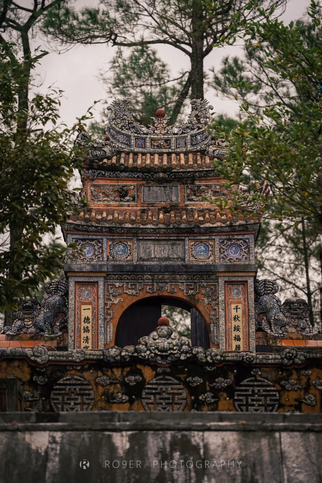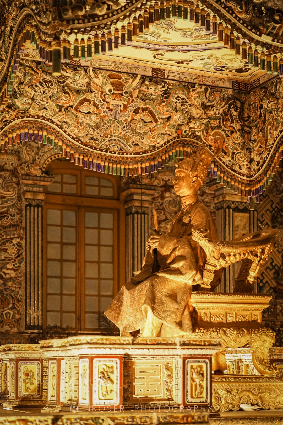 阮朝最后一座帝王陵墓,"哥特式"外观、印度教浮雕、越南传统工艺结合,既杂糅又特立独行,不过已明显可以看出西方影响,建筑也以水泥、瓷砖等现代材料构建。最核心的【紫禁殿】内部极致华丽,繁复的剪瓷装饰让人眼花缭乱,巨型的"龙云"壁画气吞山河,供奉的启定帝等身铜像造艺也很精湛,是诸多陵墓中视觉冲击最强的