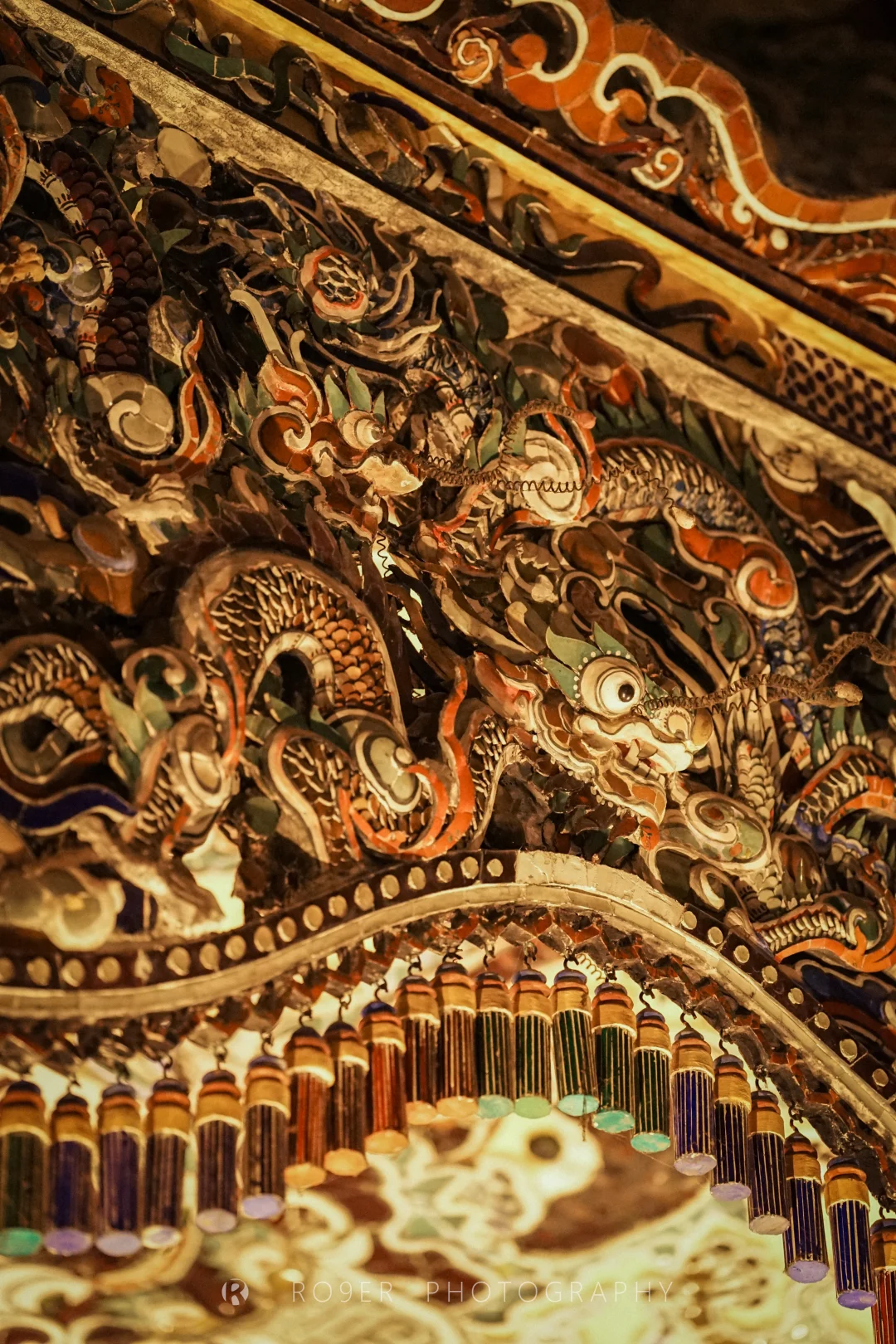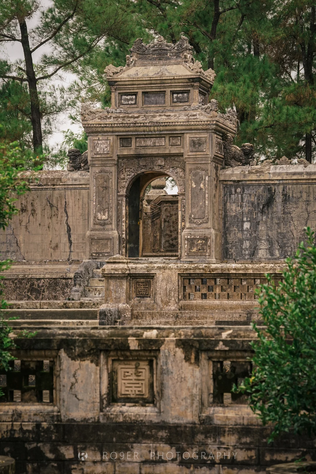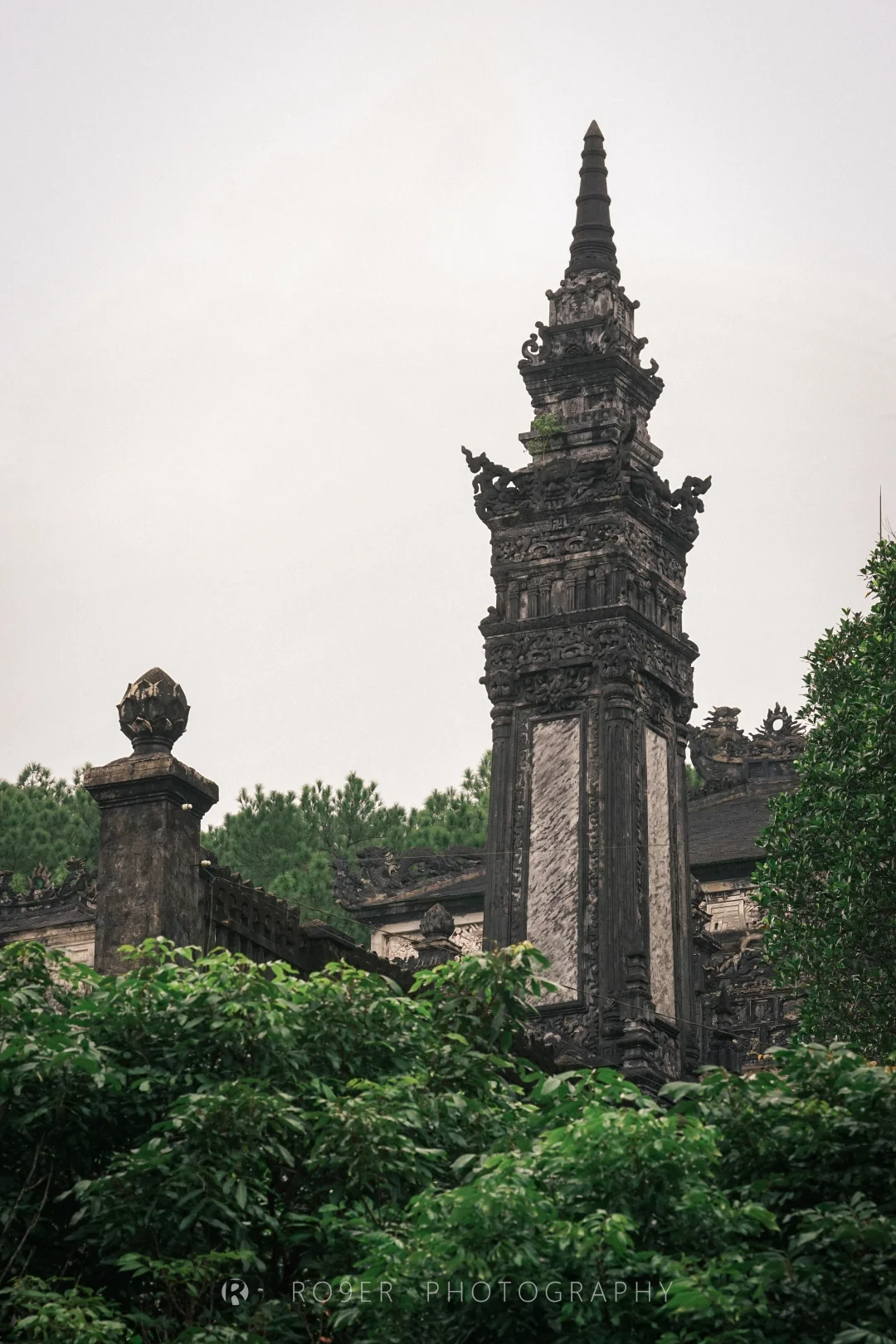 阮朝最后一座帝王陵墓,"哥特式"外观、印度教浮雕、越南传统工艺结合,既杂糅又特立独行,不过已明显可以看出西方影响,建筑也以水泥、瓷砖等现代材料构建。最核心的【紫禁殿】内部极致华丽,繁复的剪瓷装饰让人眼花缭乱,巨型的"龙云"壁画气吞山河,供奉的启定帝等身铜像造艺也很精湛,是诸多陵墓中视觉冲击最强的