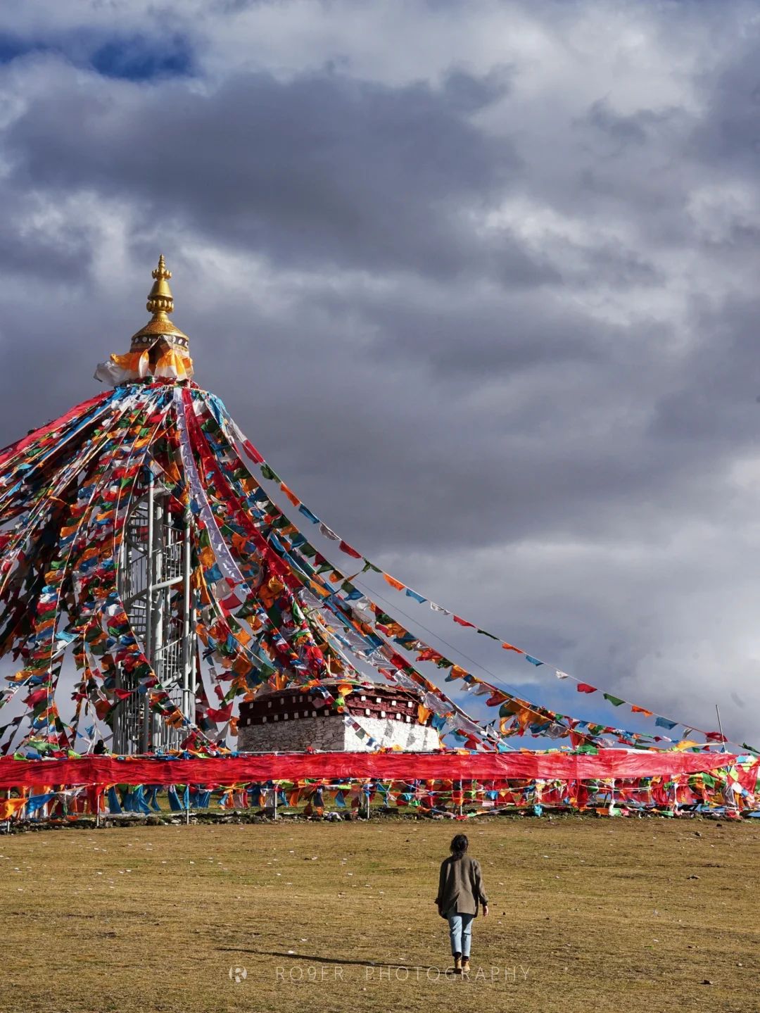 👉参观结束后别急着离开,出门顺院墙可登上【东山顶】,巨大的经幡下既可俯瞰夕阳下被雪山草甸包围的理塘全景,又能将寺院尽收眼底,很适合傍晚闲坐