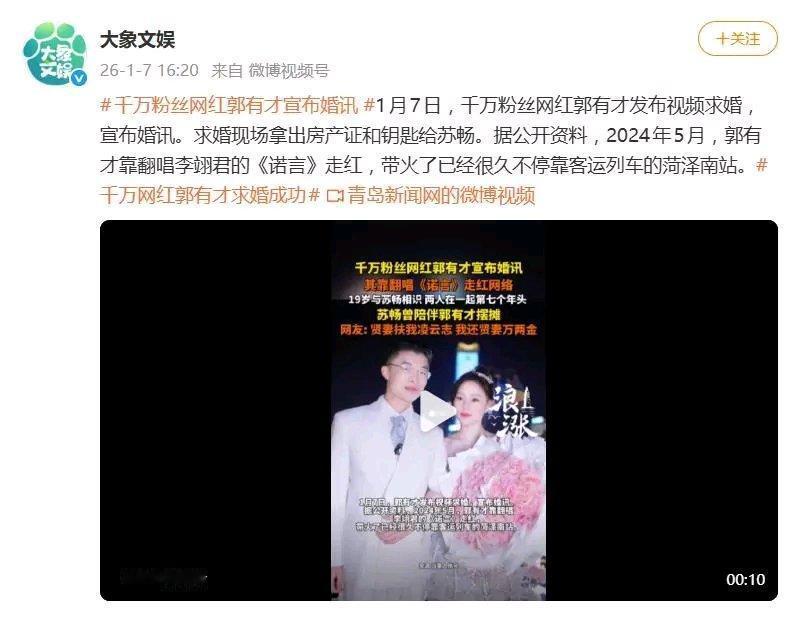 千万粉丝网红郭有才求婚这事儿太让人感动了!520当天,他向女友苏畅求婚,现场拿出房产证和钥匙,这诚意直接拉满。 郭有才靠翻唱李翊君的《诺言》走红,一路走来不容易。苏畅陪伴他五年,寒冬陪卖烧烤,夏天在炉旁擦汗,这份付出终有回报。求婚时,他一句“我爱你”让全场沸腾,直播间百万网友送上祝福。他铭记女友的陪伴,借这个特殊日子表达感谢。他虽是从贫寒中拼搏出来的90后,但三观正、正能量足,能成功也是必然。希望他俩能一直幸福下去!