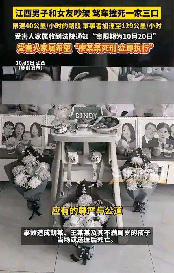 2026年1月9日,景德镇一家三口被撞身亡案就要宣判了。这肇事司机廖某某的情绪失控理由简直荒唐透顶。他和女性朋友竟因“鹦鹉何时开始学舌”起了争执,一个说五六千年前,一个觉得更晚,就这么个事儿,他就生闷气,觉得对方抬杠。 等绿灯一亮,他直接踩下100%电门,女友劝阻都没用,车速飙到129公里/时,直接撞上了正在过马路的一家三口。这廖某某大专没毕业,才20岁,还抱怨工作工资低要辞职。就因为这点破事儿,让三条鲜活的生命消逝,真让人愤怒,希望法律能给出公正的判决。