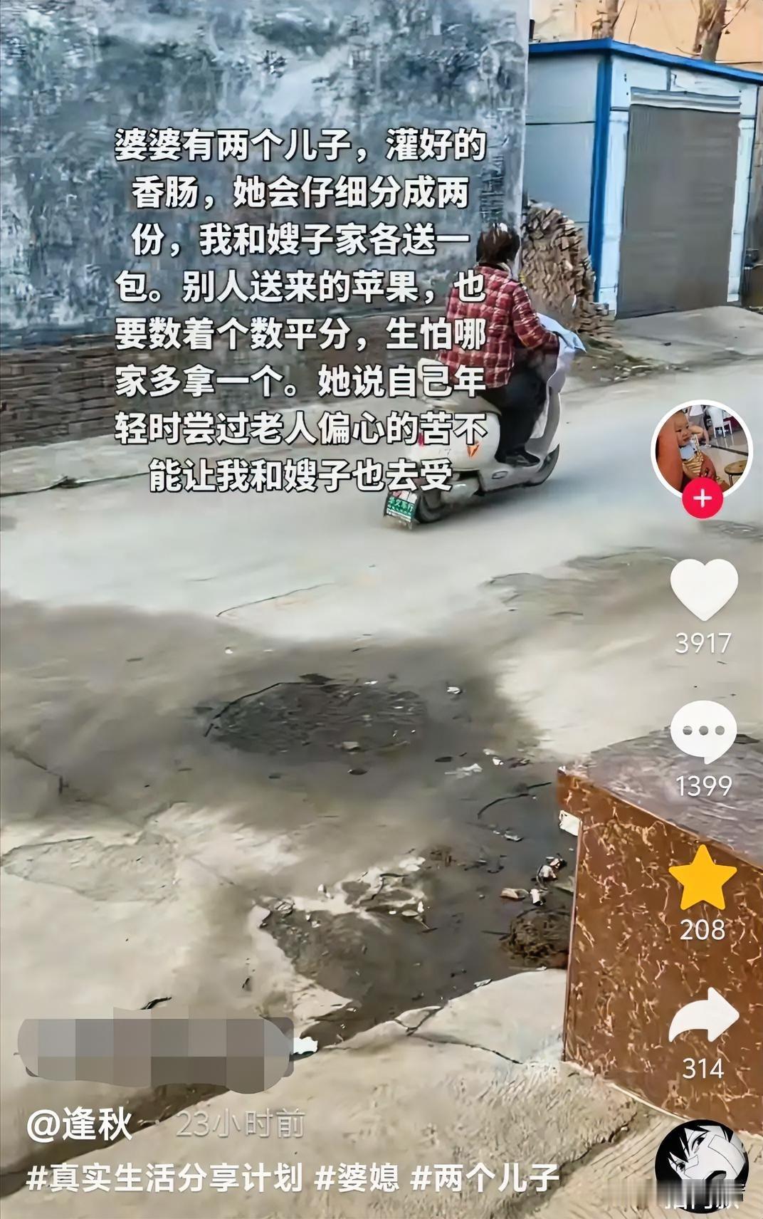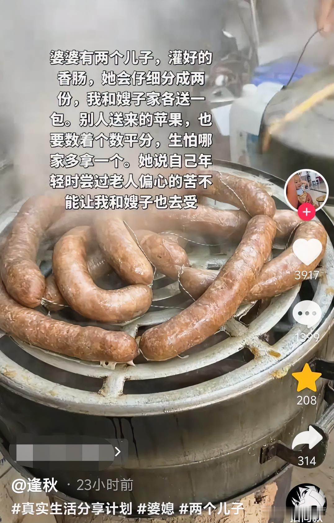 近日,河南新乡,一名女子下班回家,看到婆婆在厨房里忙活着。女子掀开锅盖一看,里面蒸了5、6斤香肠。婆婆分了一半装进方便袋,骑着电车匆匆忙忙就出门了。 婆婆说,你爸弟兄们多,自己年轻时受过老人偏心的苦,为此没少和你爸吵架。现在虽然不缺吃喝了,但是我经历的事儿不能让你和嫂子也去受。 据了解,婆婆有两个儿子,灌好的香肠,她会仔细分成两份,女子和嫂子家各送一包,就连别人送来的苹果,也要数着个数平分,生怕哪家多拿一个。 看了视频,婆婆这做法真的特别实在,经历过偏心的苦,才更懂一碗水端平的重要。她把香肠、苹果都细心平分,不是计较,是不想让俩儿媳受自己当年的委屈,这份心意特别暖。 其实过日子最怕的就是“不公”俩字,东西值不值钱是小事,偏心带来的隔应才磨人。婆婆用这种笨方法,把公平摆在明面上,能少很多家庭矛盾,特别明智。 有这样的婆婆是福气,她没把儿媳当外人,而是真的放在心上疼。这种不偏不倚的处事方式,能让两家人相处更和睦,也能让小辈们更愿意真心对待。(来源:逢秋)